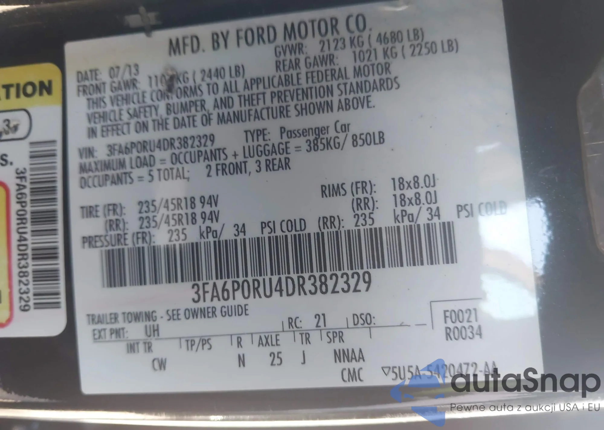 The car Ford Fusion 2013 (VIN 3FA6P0RU4DR382329) has not been auctioned before. The documents are clean, and the mileage matches or is below the market average. Sold by an insurance company – we recommend purchase. Delivery to the port will take approx. 6–8 weeks.