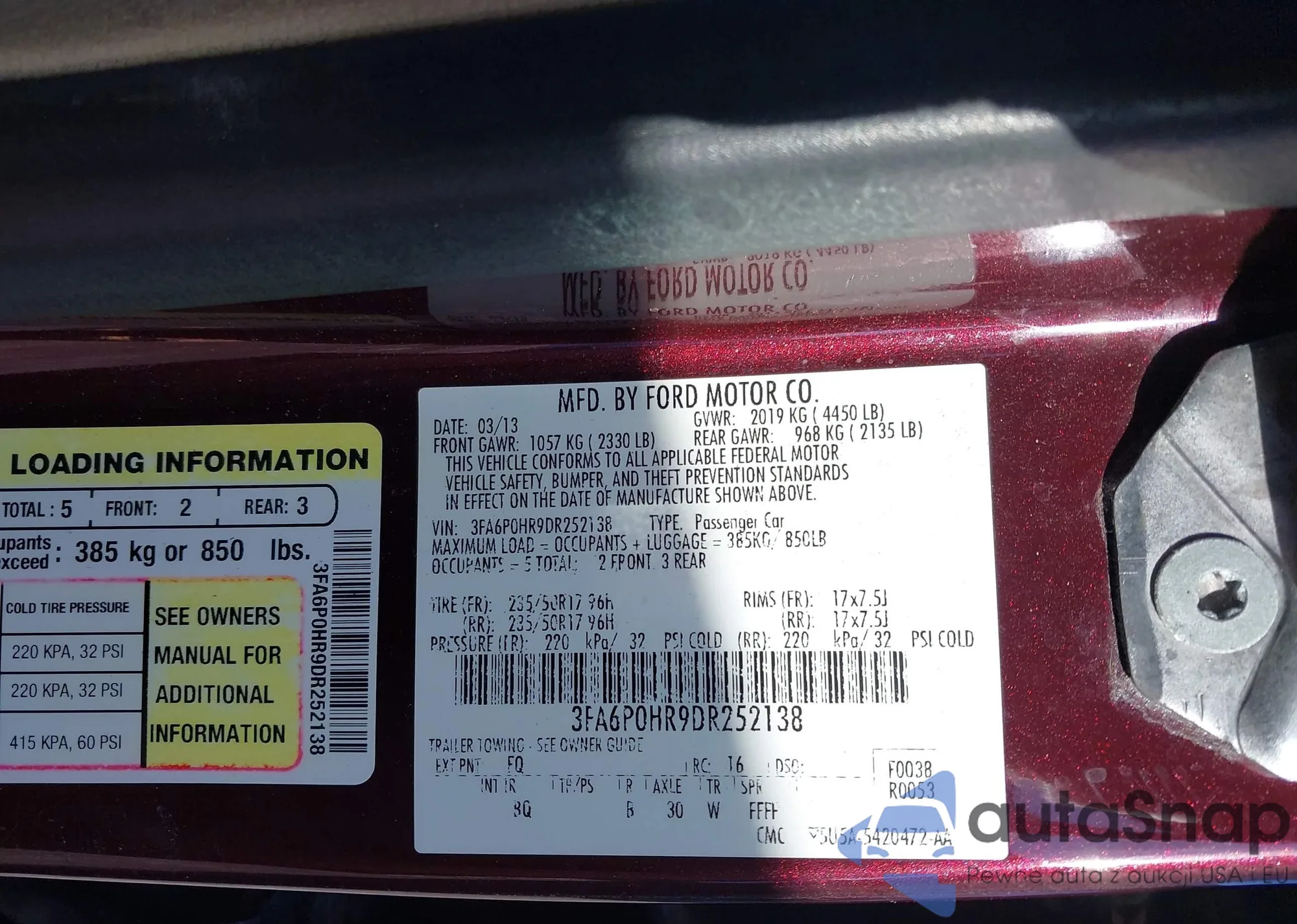 The car Ford Fusion 2013 (VIN 3FA6P0HR9DR252138) has not been auctioned before. The documents are clean, and the mileage matches or is below the market average. Sold by an insurance company – we recommend purchase. Delivery to the port will take approx. 6–8 weeks.