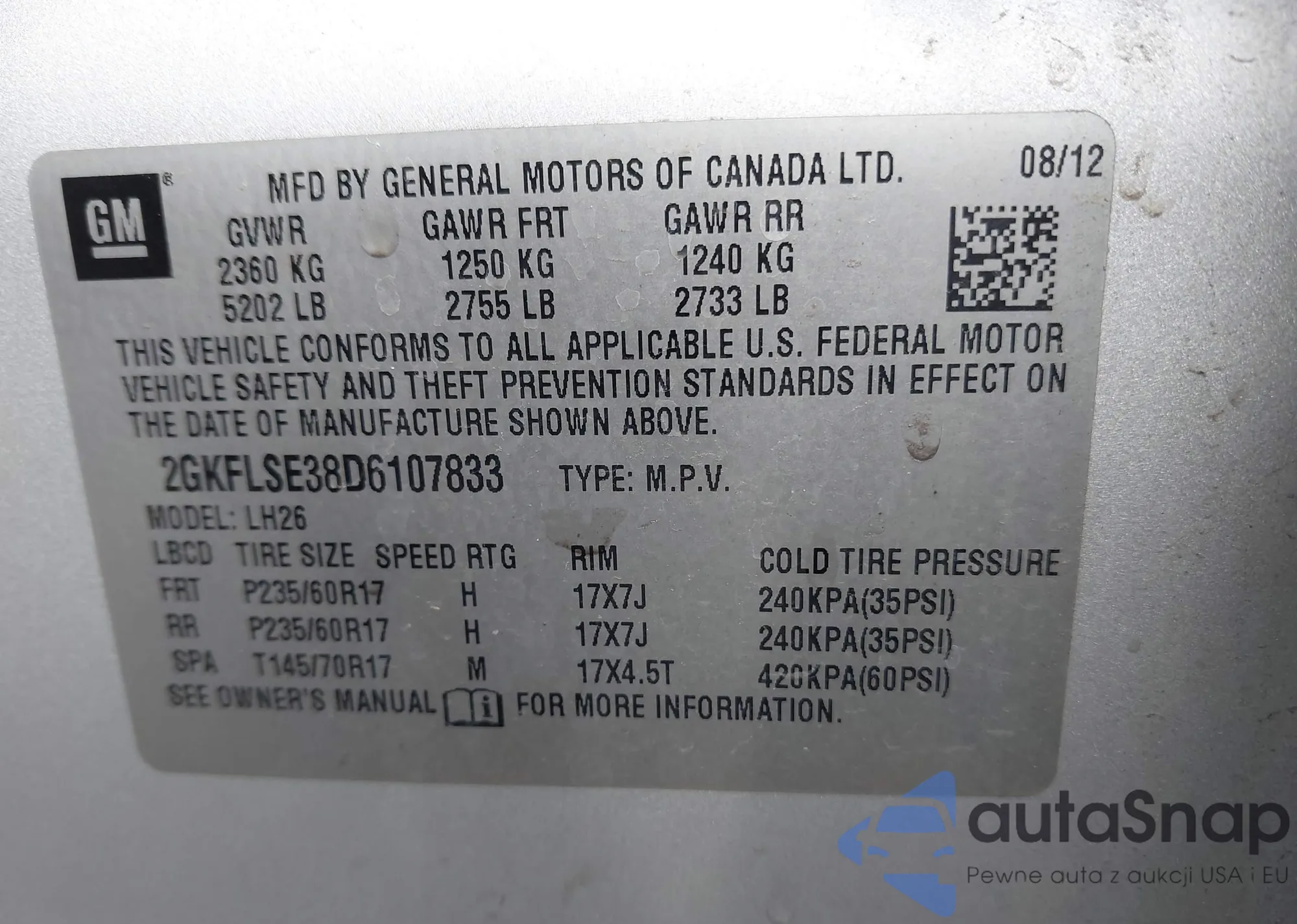 VIN: 2GKFLSE38D6107833