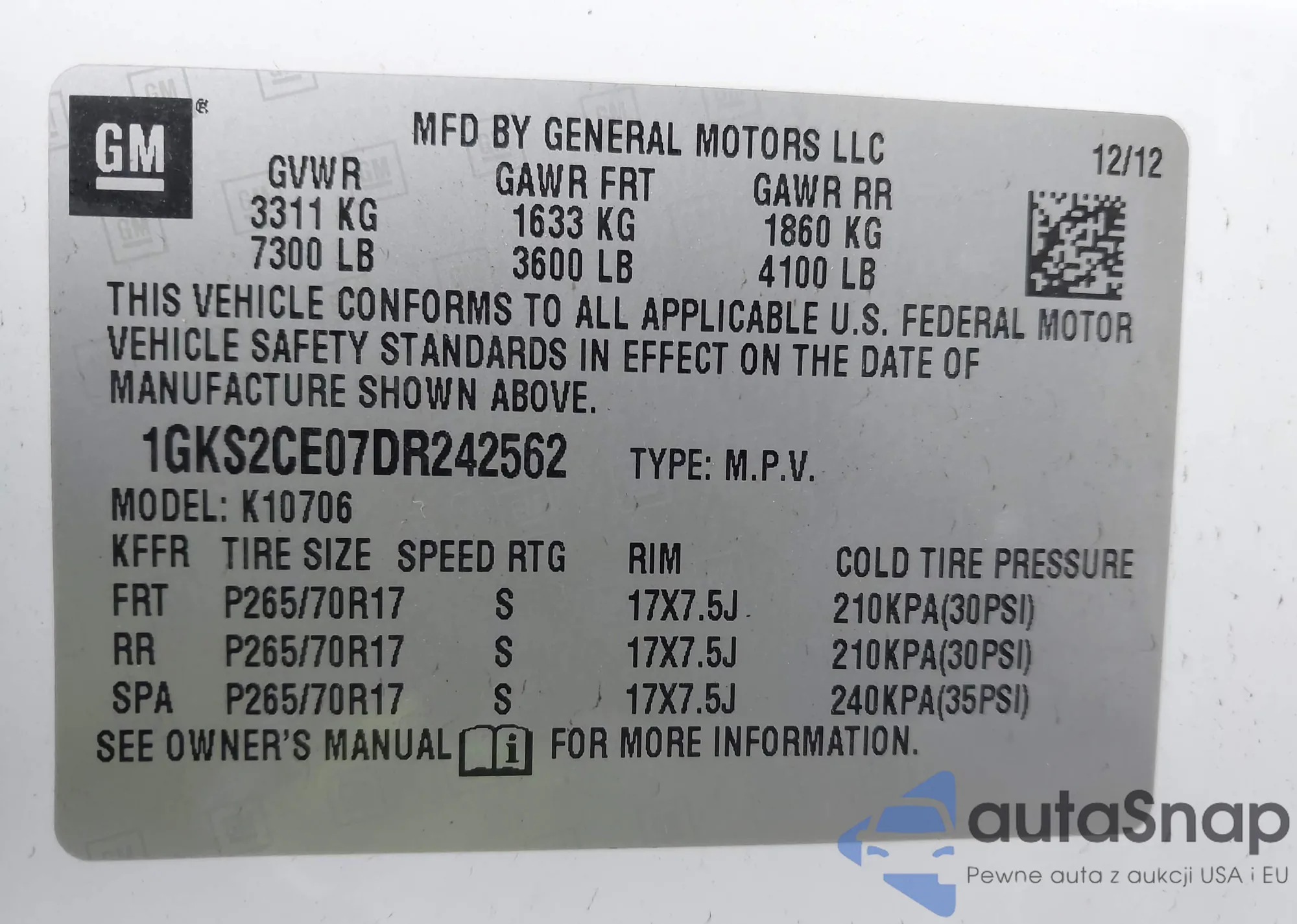 VIN: 1GKS2CE07DR242562