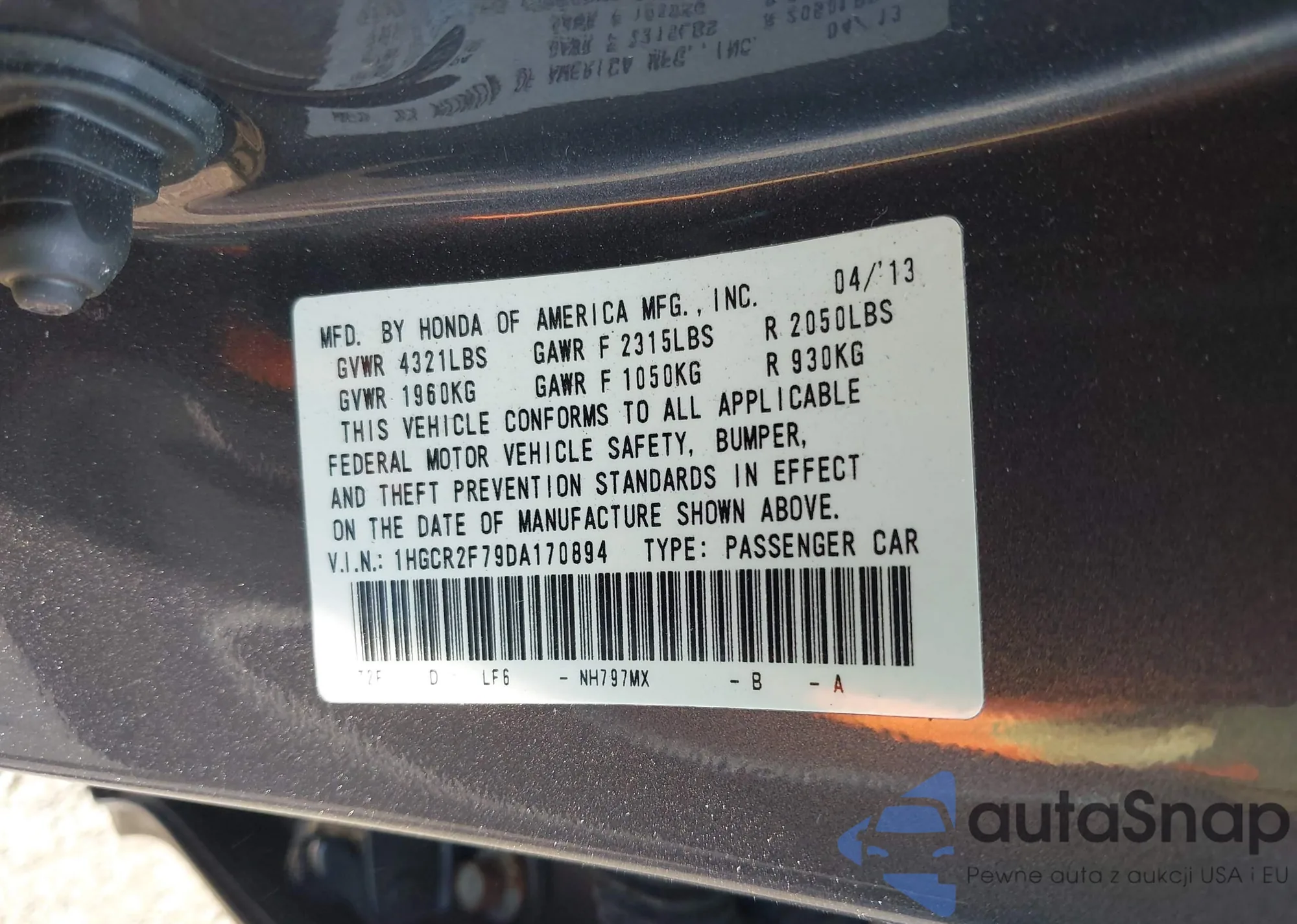 • VIN: 1HGCR2F79DA170894
