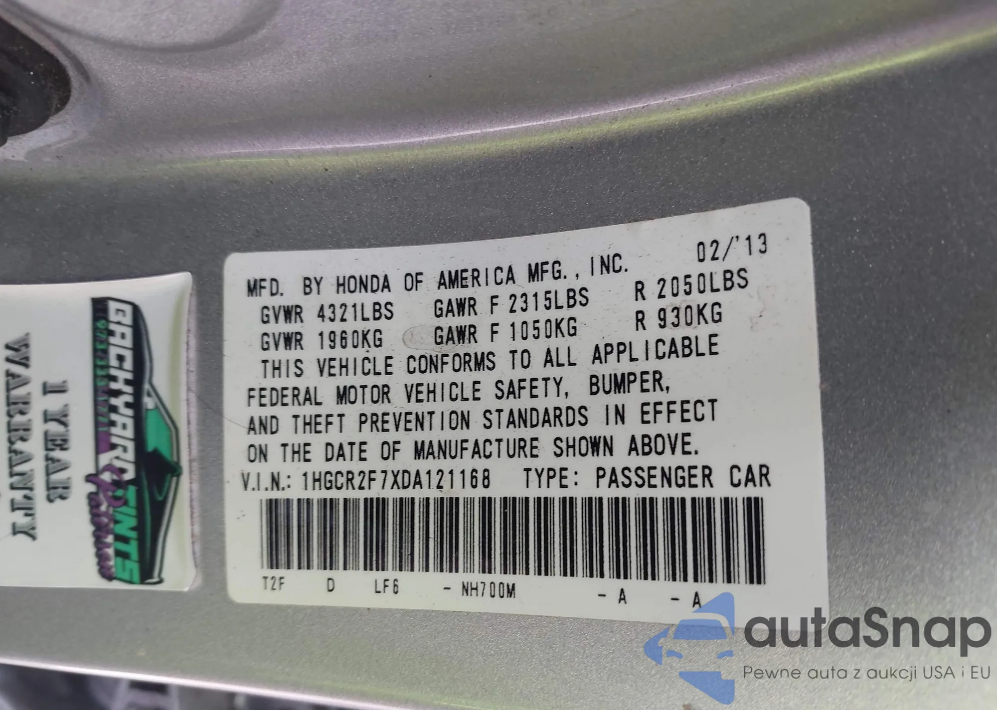 VIN: 1HGCR2F7XDA121168