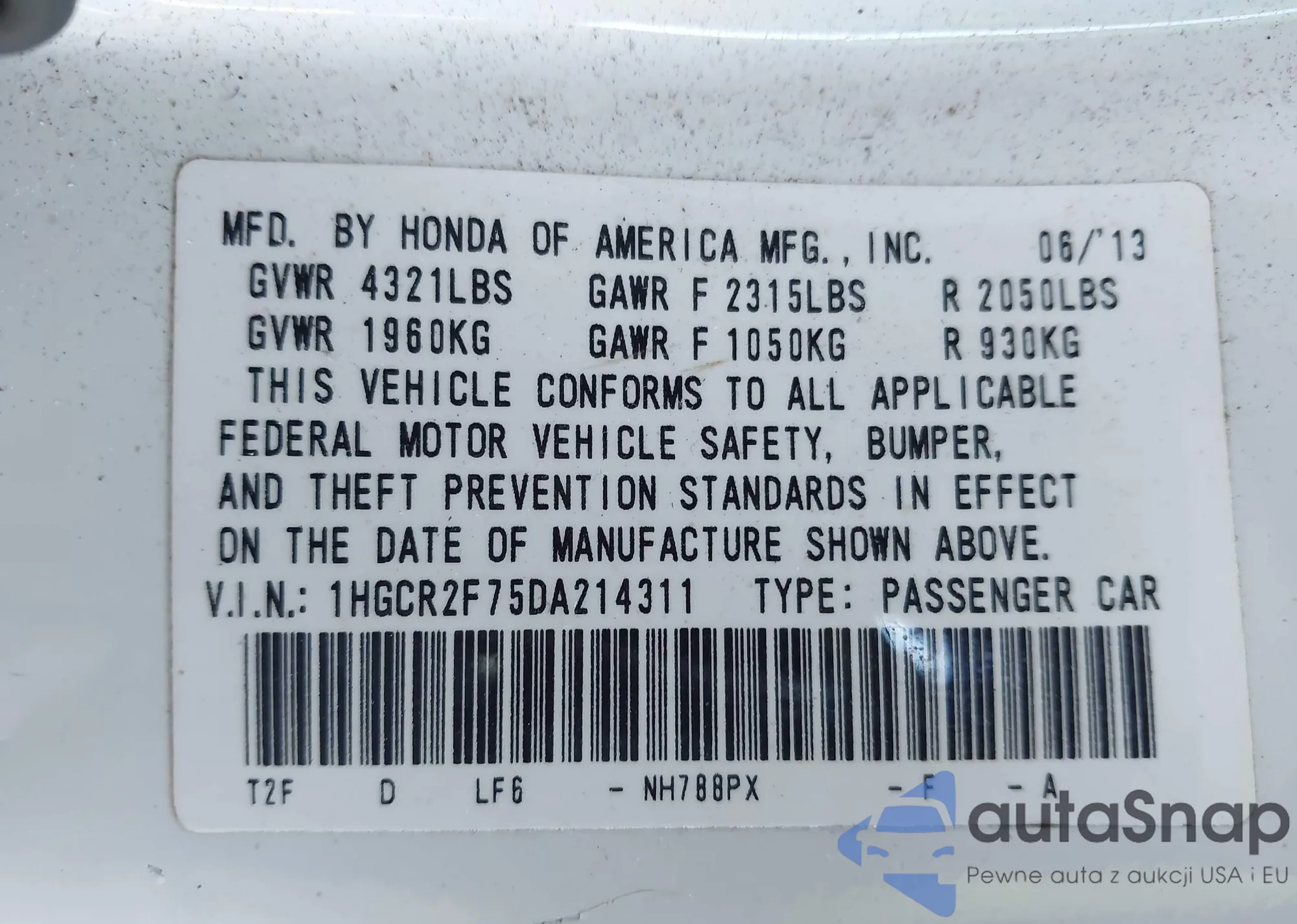 VIN: 1HGCR2F75DA214311