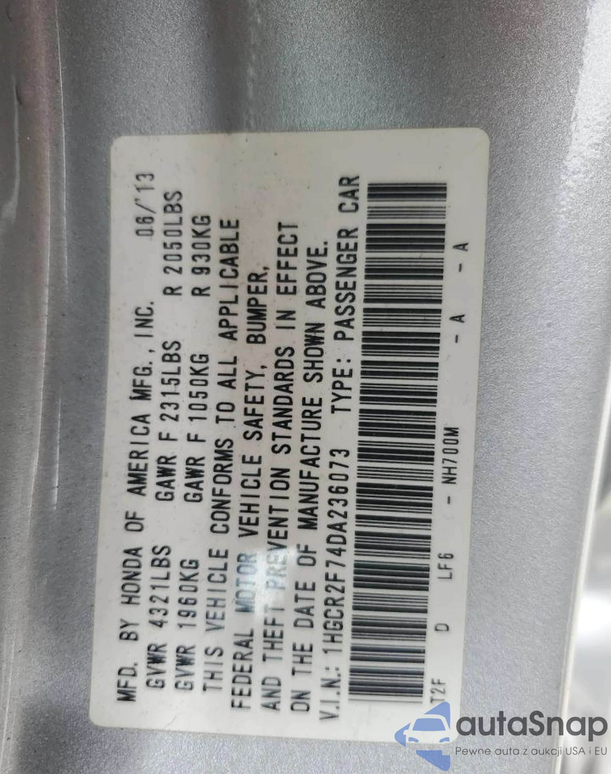 VIN: 1HGCR2F74DA236073