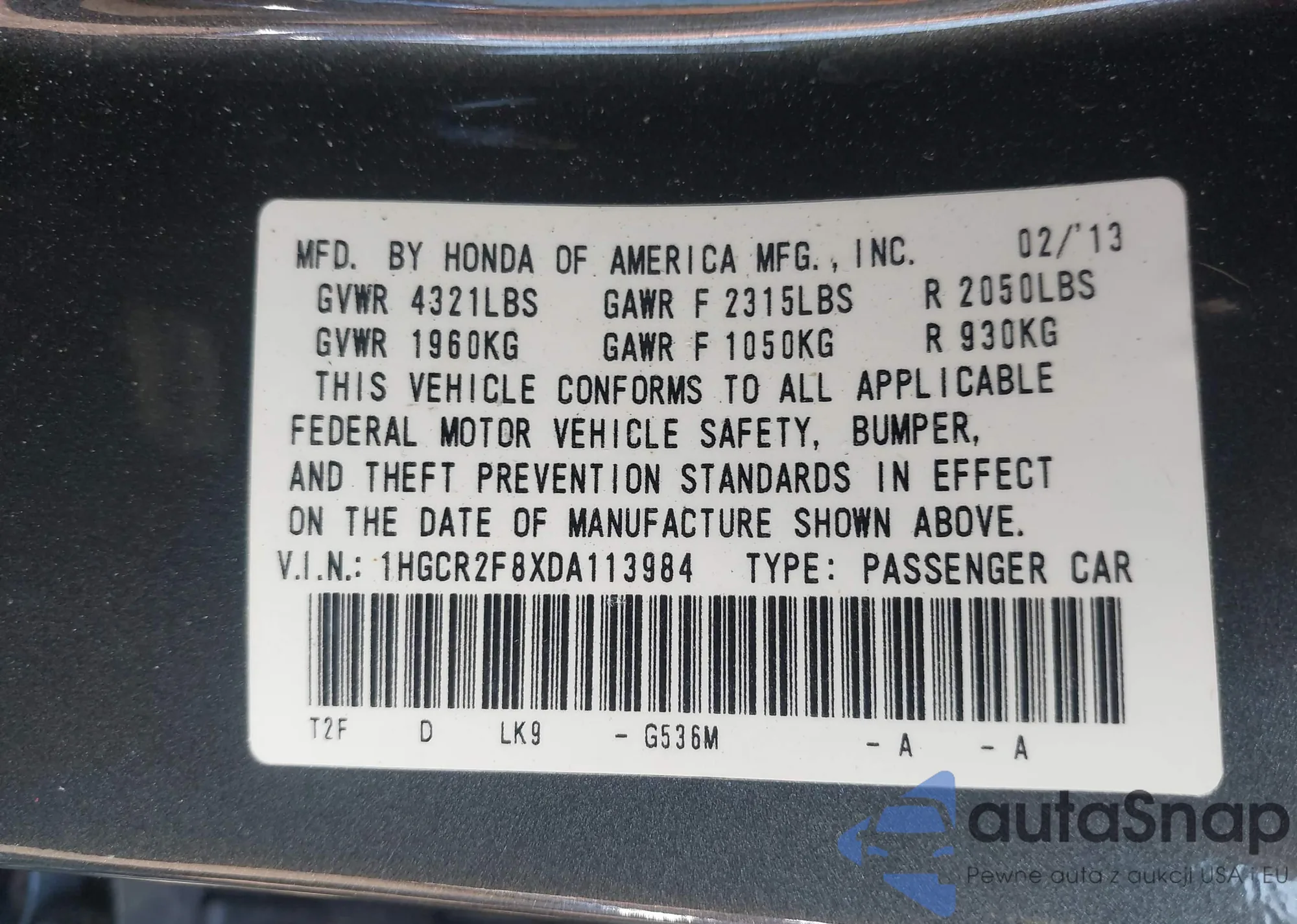 VIN: 1HGCR2F8XDA113984