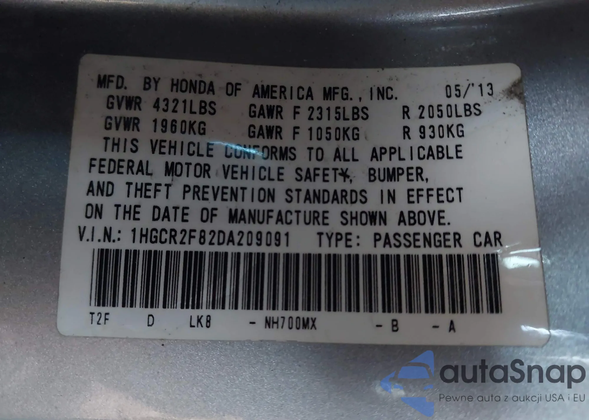 The car Honda Accord 2013 (VIN 1HGCR2F82DA209091) has not been auctioned before. The documents are clean, and the mileage matches or is below the market average. Sold by an insurance company – we recommend purchase. Delivery to the port will take approx. 6–8 weeks.