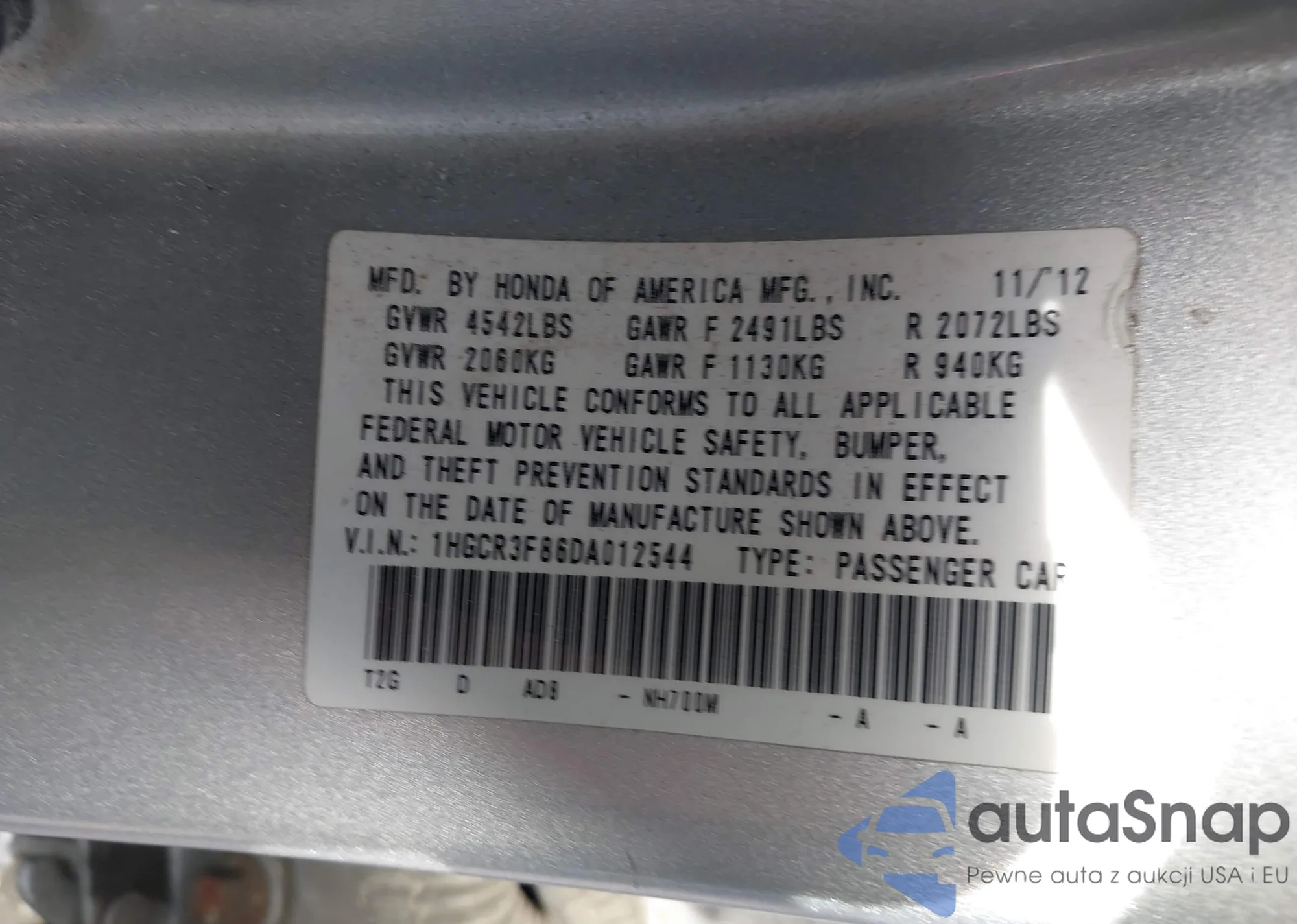 The car Honda Accord 2013 (VIN 1HGCR3F86DA012544) has not been auctioned before. The documents are clean, and the mileage matches or is below the market average. Sold by an insurance company – we recommend purchase. Delivery to the port will take approx. 6–8 weeks.