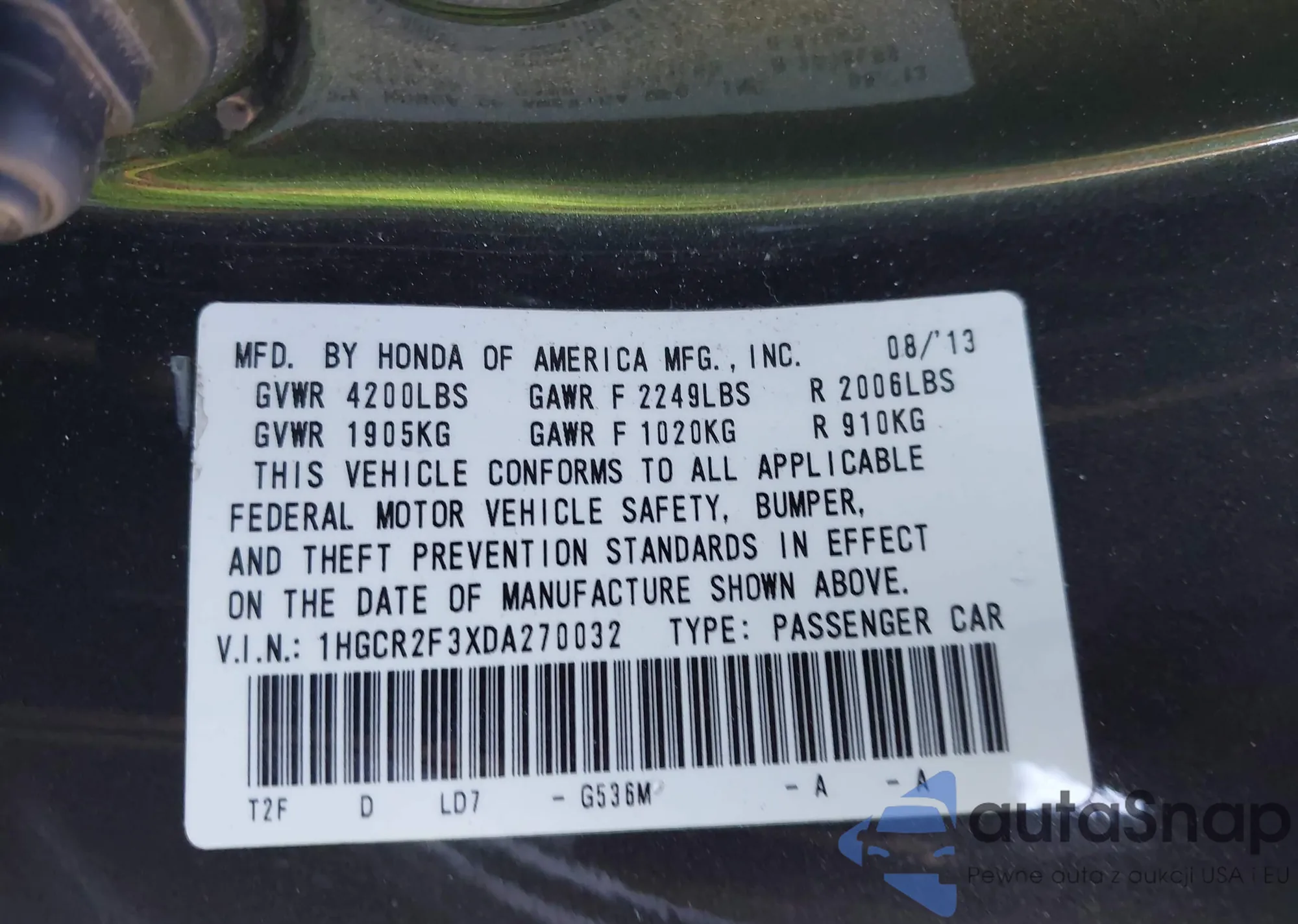 VIN: 1HGCR2F3XDA270032