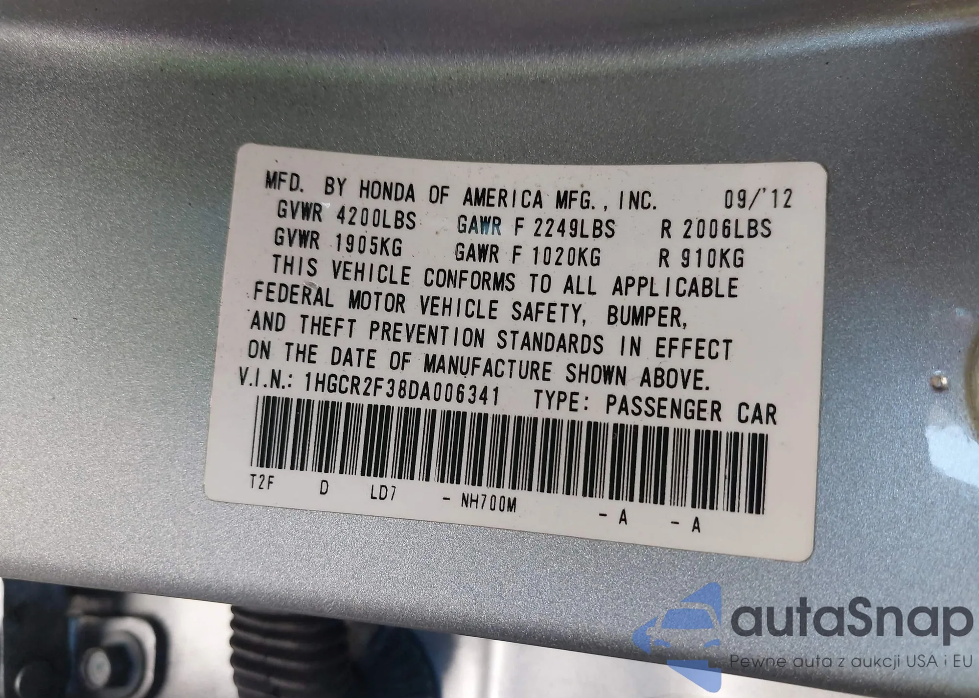 VIN: 1HGCR2F38DA006341