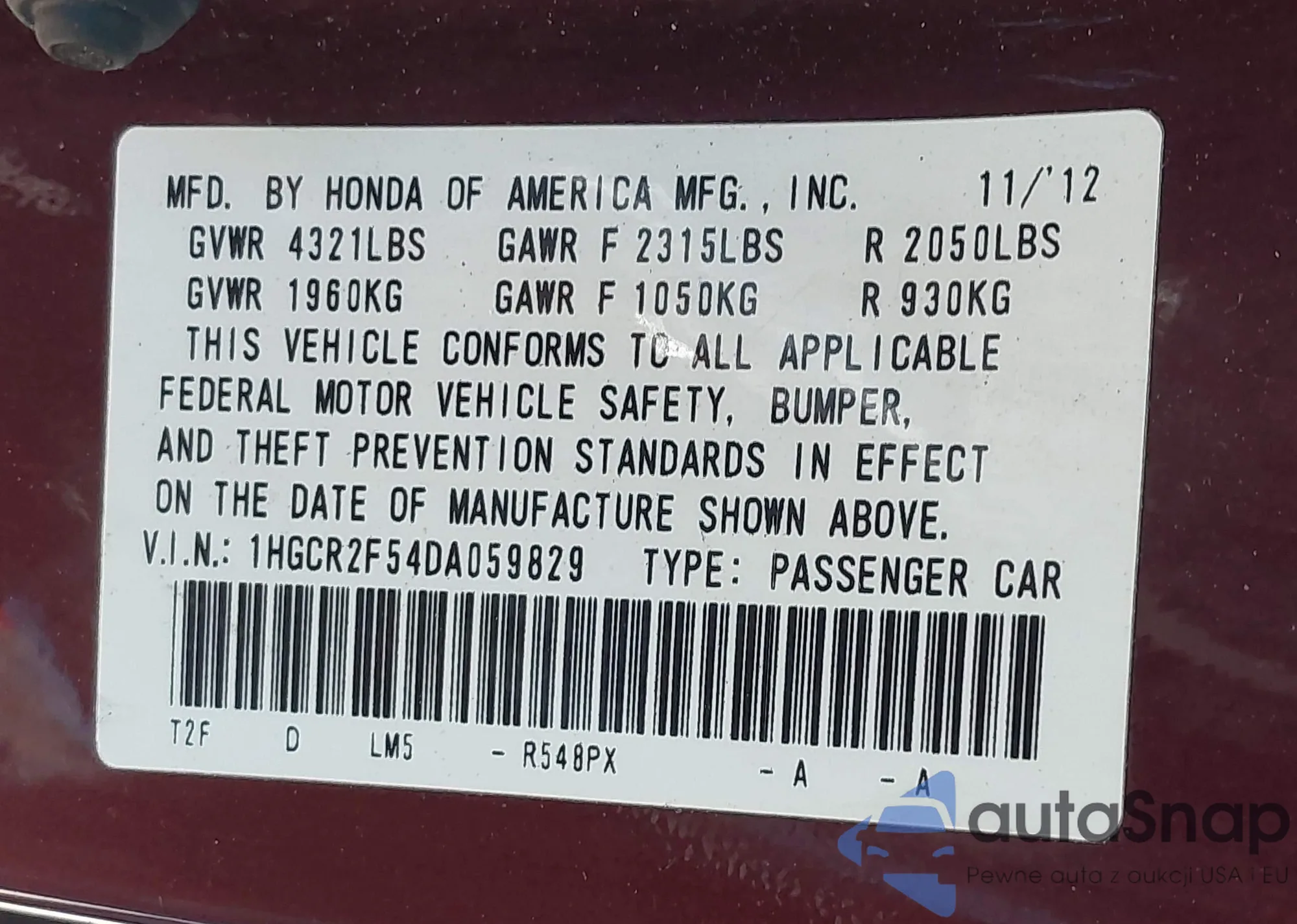 VIN: 1HGCR2F54DA059829