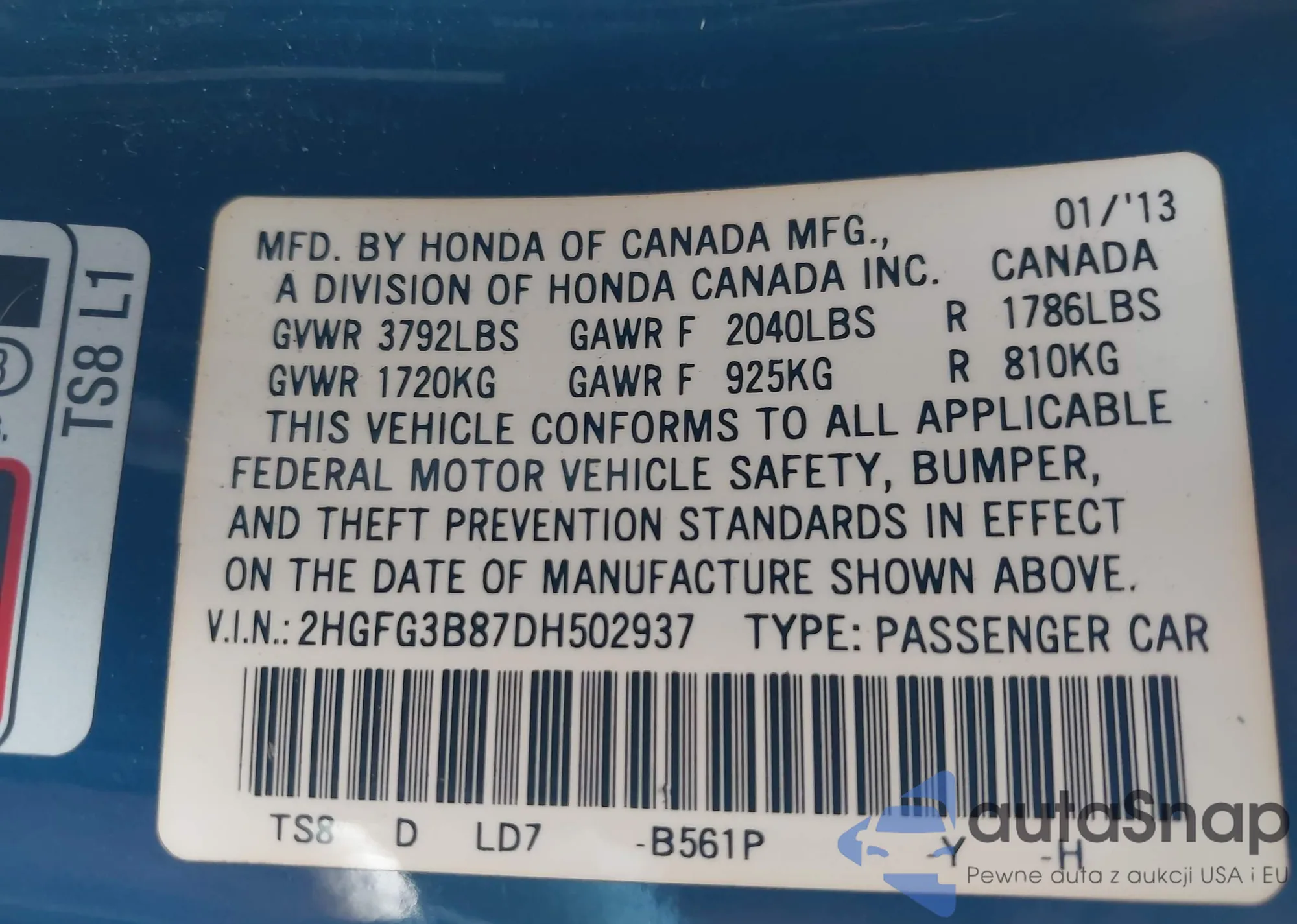 VIN: 2HGFG3B87DH502937