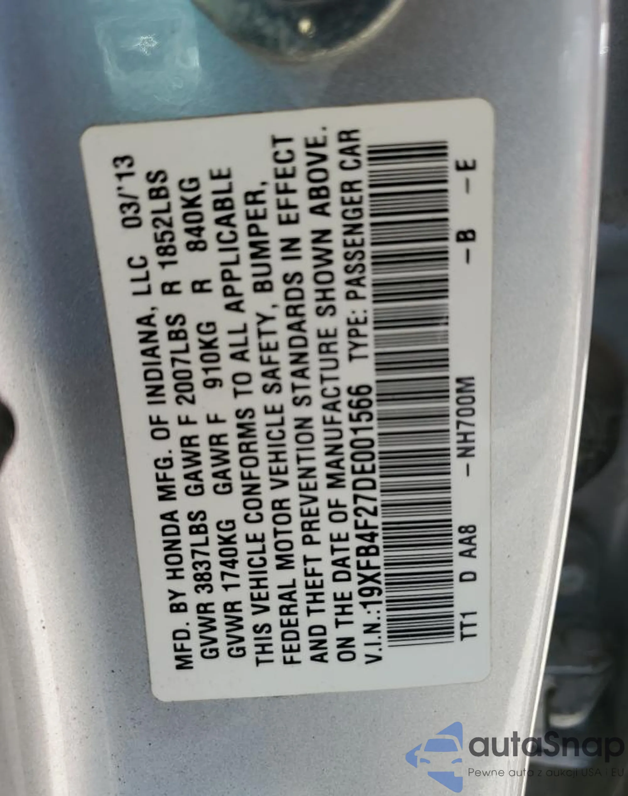 VIN: 19XFB4F27DE001566