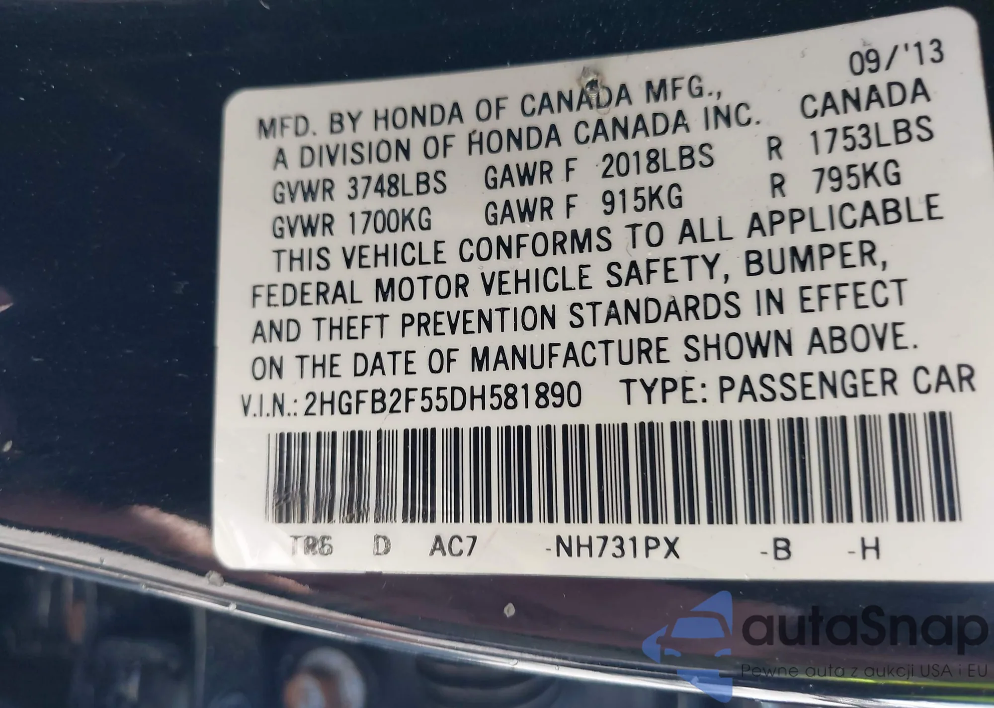 VIN: 2HGFB2F55DH581890