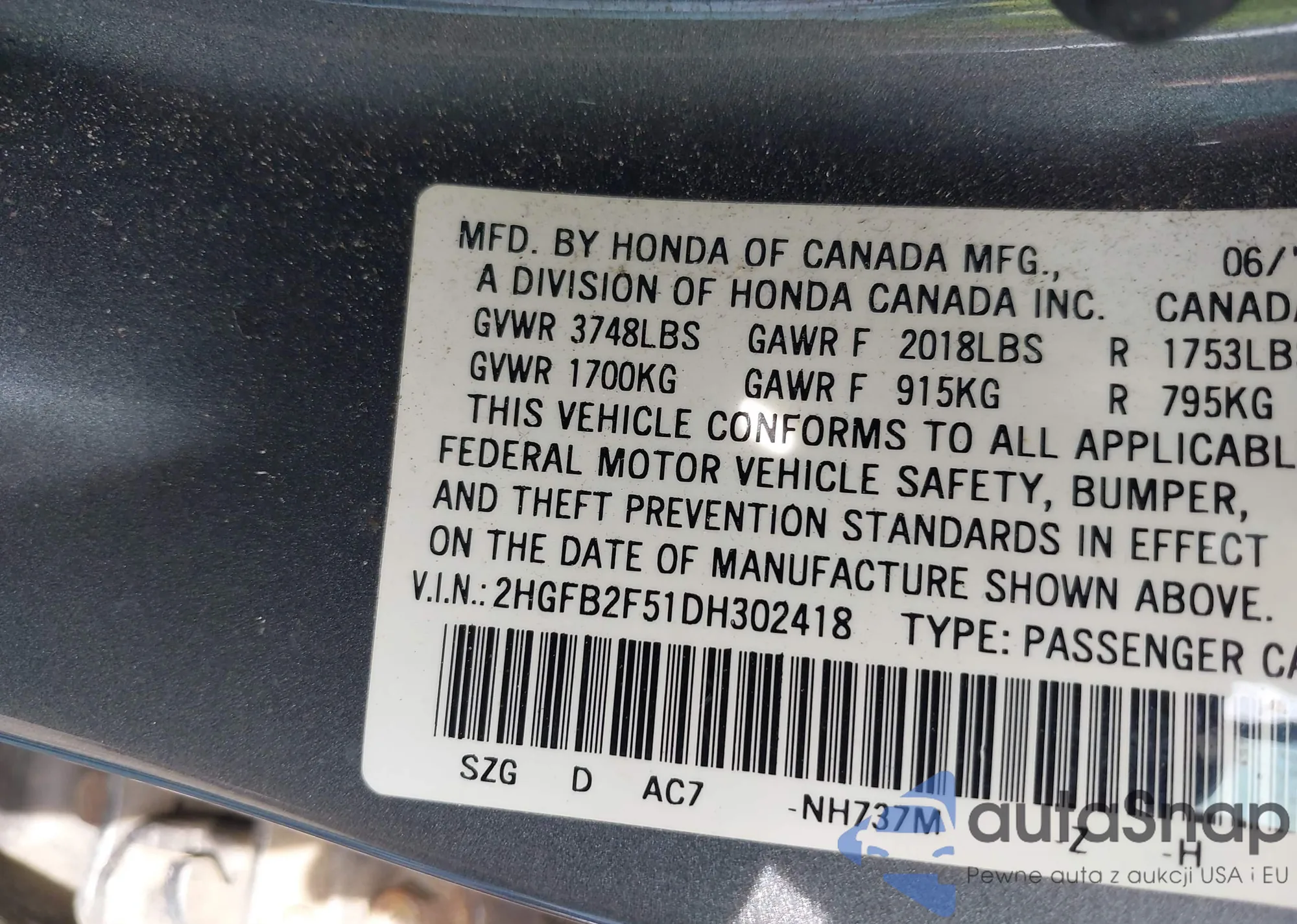 VIN: 2HGFB2F51DH302418