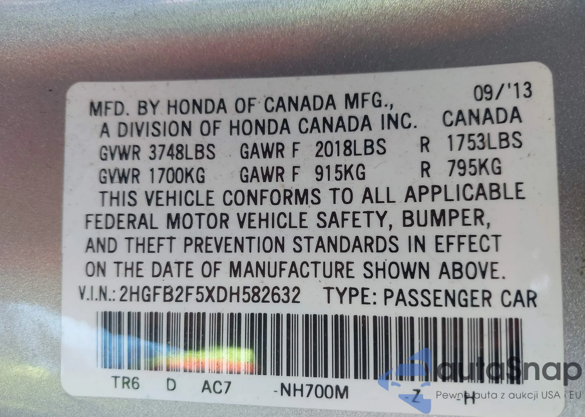 VIN: 2HGFB2F5XDH582632