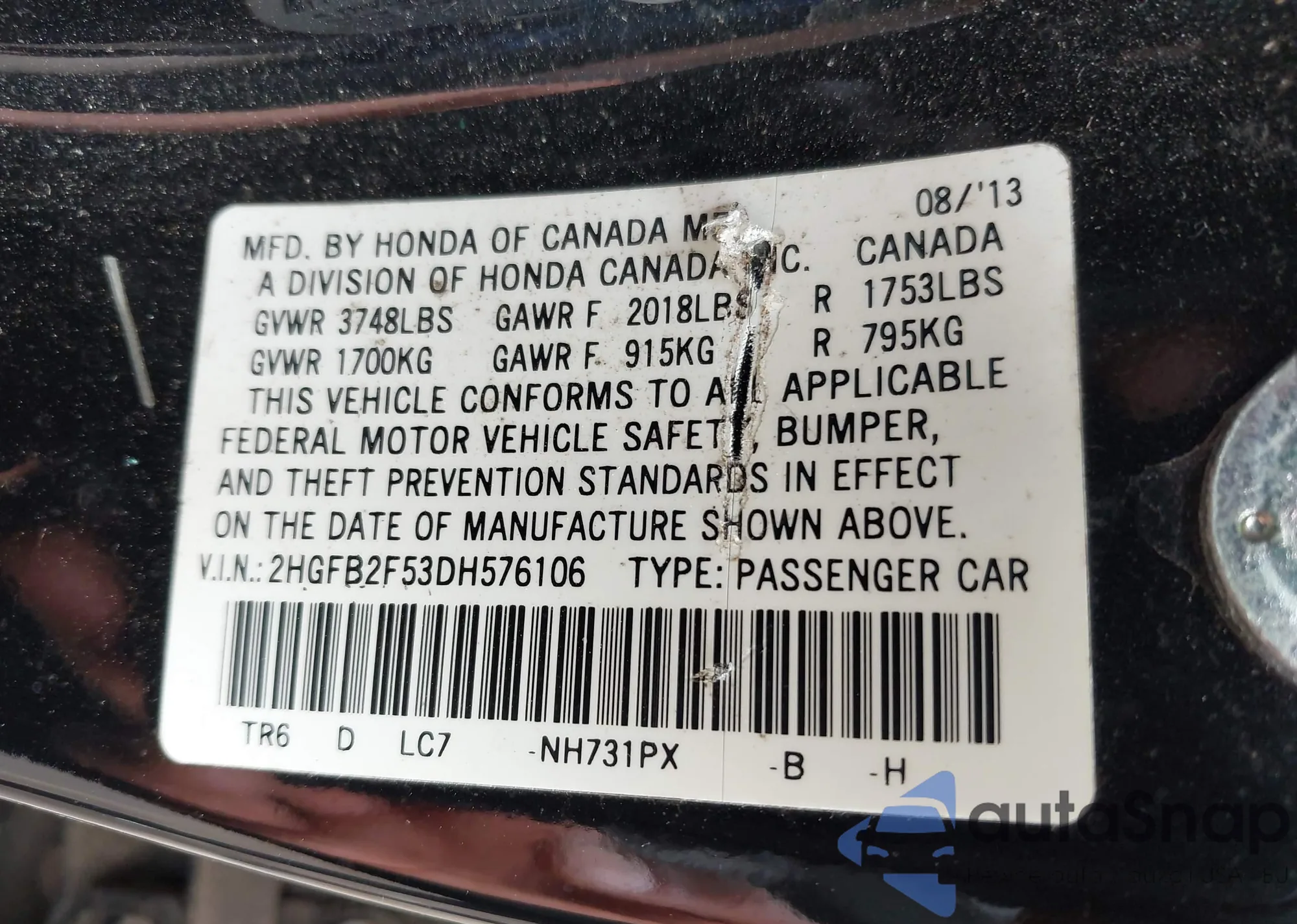 VIN: 2HGFB2F53DH576106