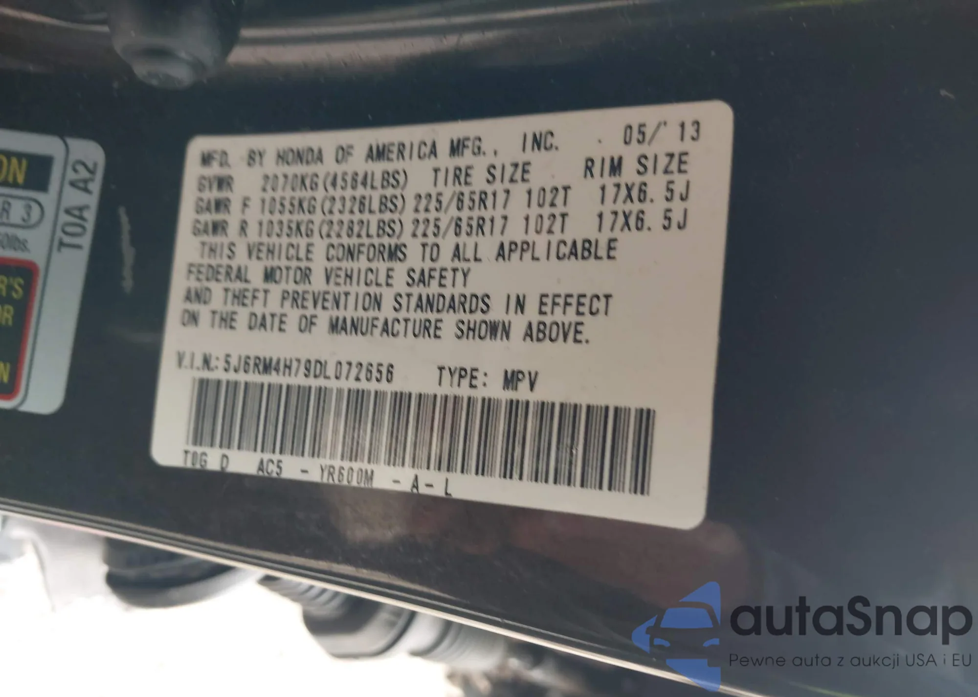 VIN: 5J6RM4H79DL072656