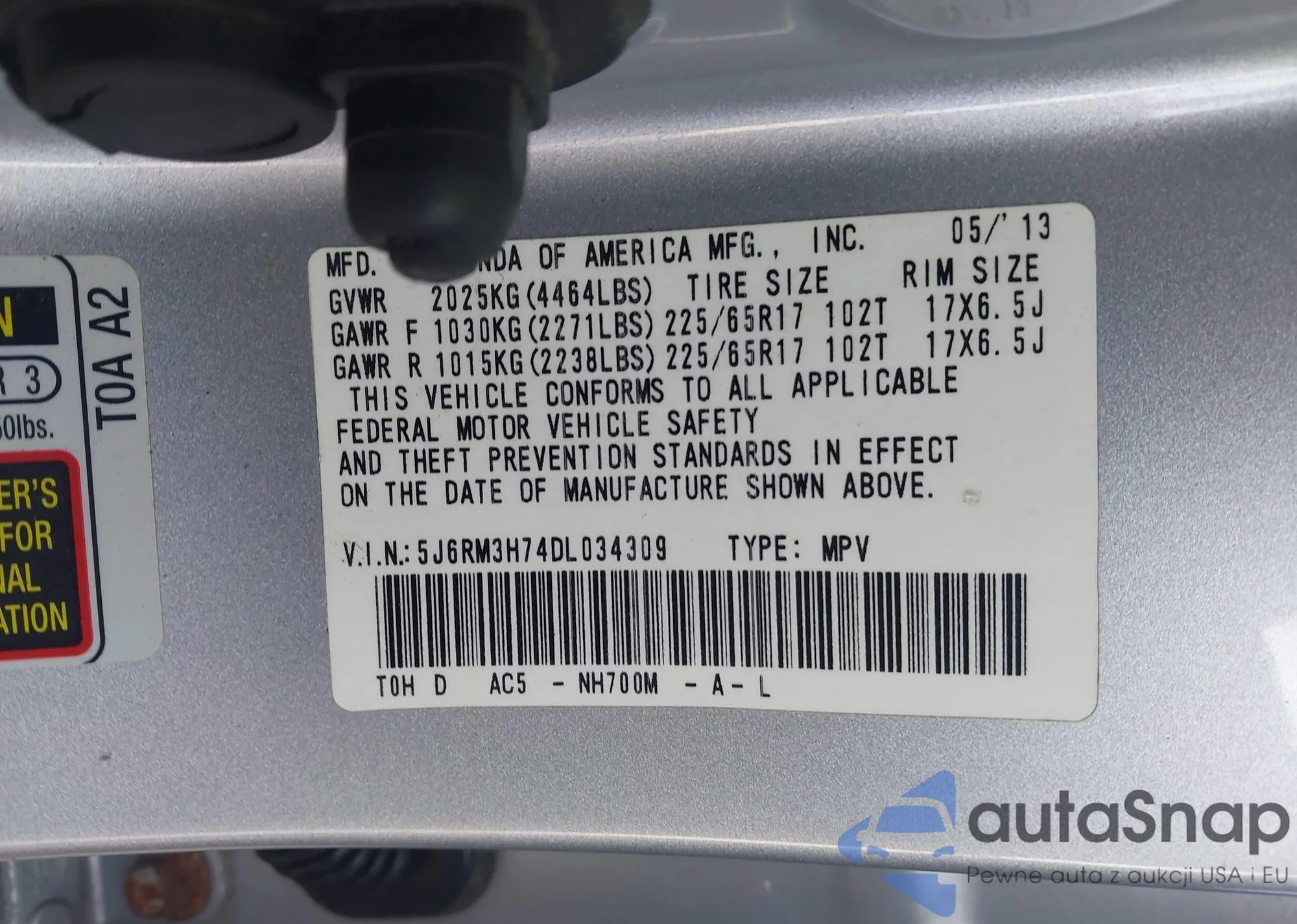 VIN: 5J6RM3H74DL034309