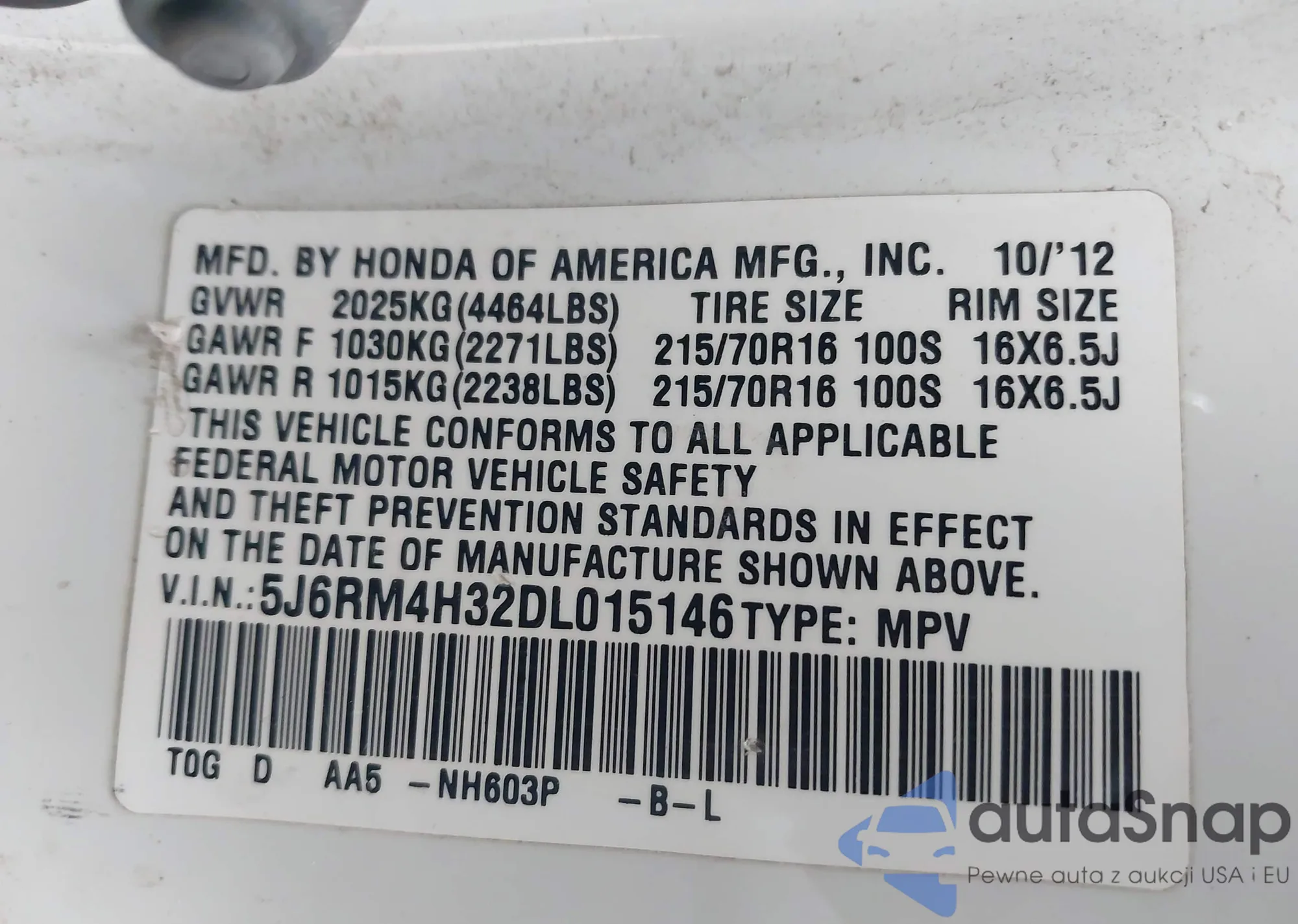 VIN: 5J6RM4H32DL015146