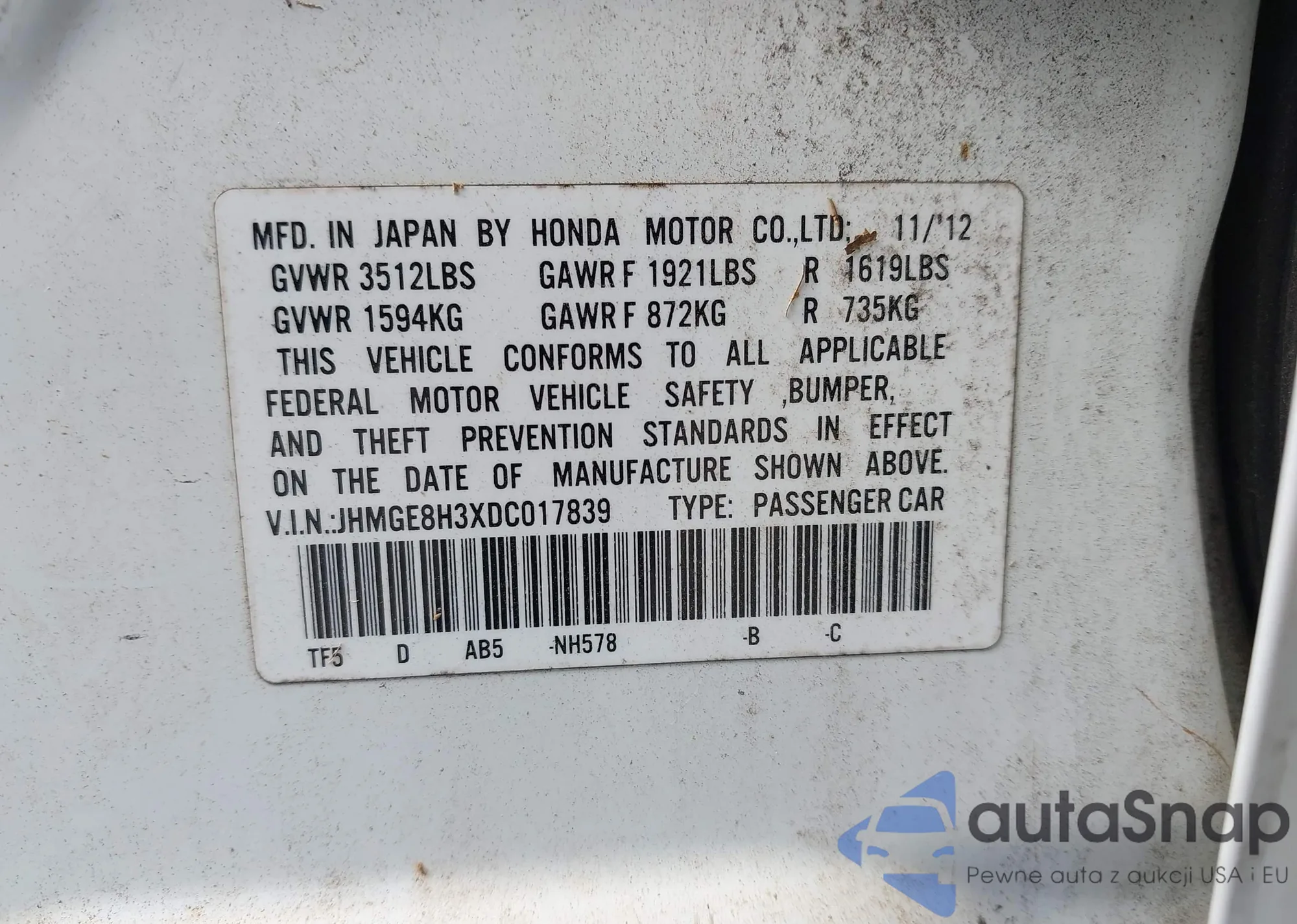 VIN: JHMGE8H3XDC017839