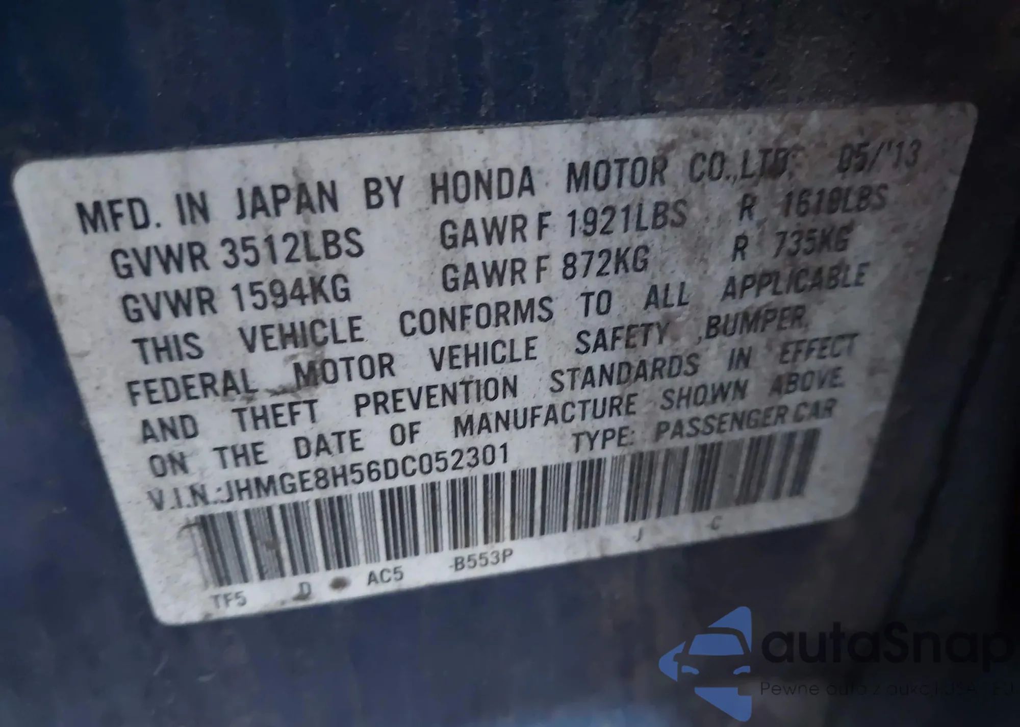 VIN: JHMGE8H56DC052301