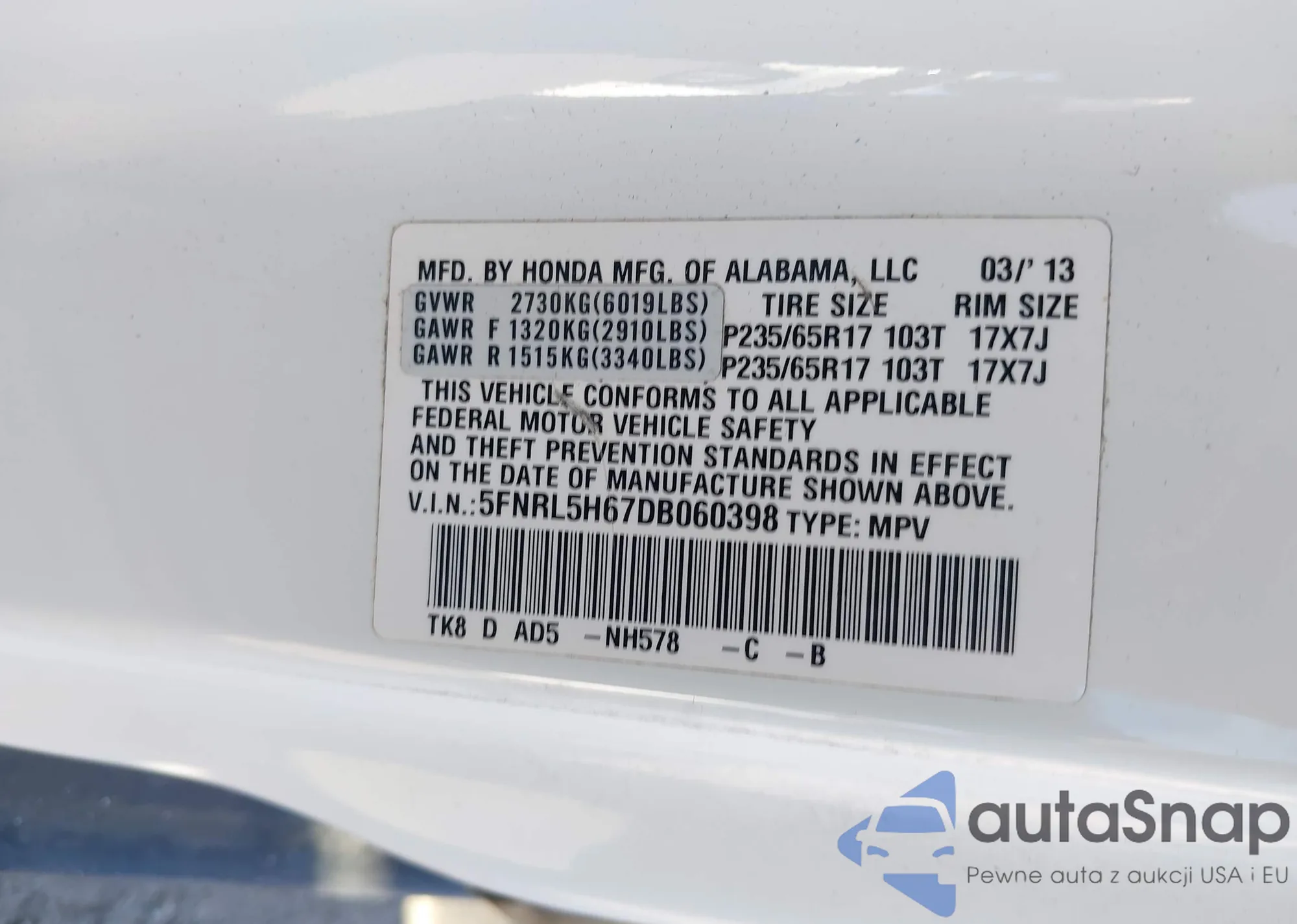 The car Honda Odyssey 2013 (VIN 5FNRL5H67DB060398) has not been auctioned before. The documents are clean, and the mileage matches or is below the market average. Sold by an insurance company – we recommend purchase. Delivery to the port will take approx. 6–8 weeks.