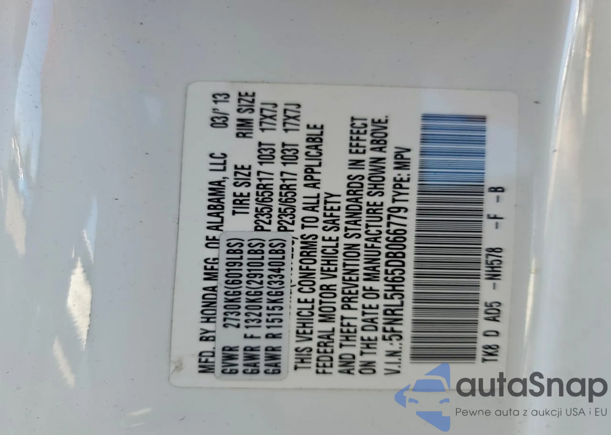 VIN: 5FNRL5H65DB066779
