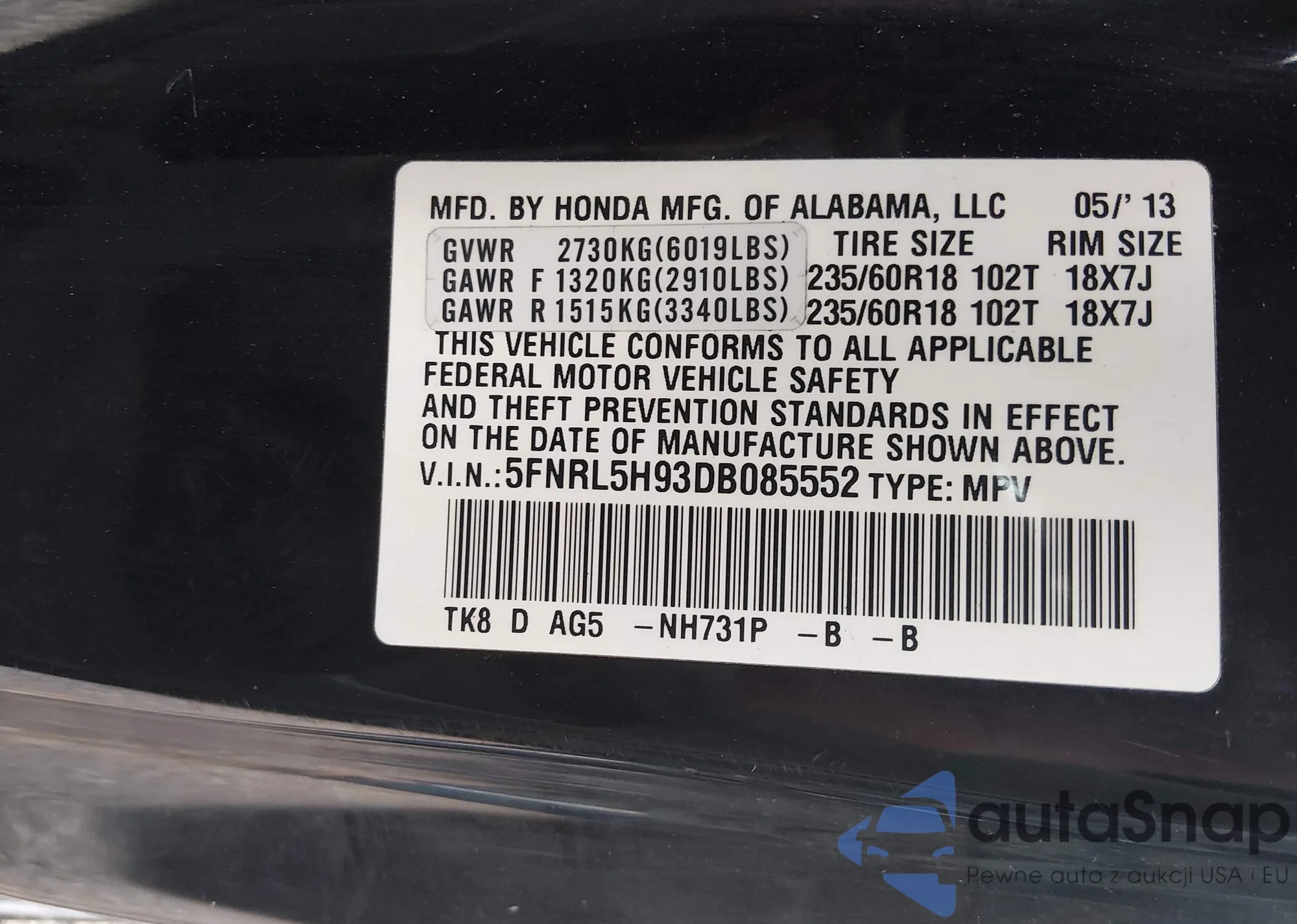VIN: 5FNRL5H93DB085552