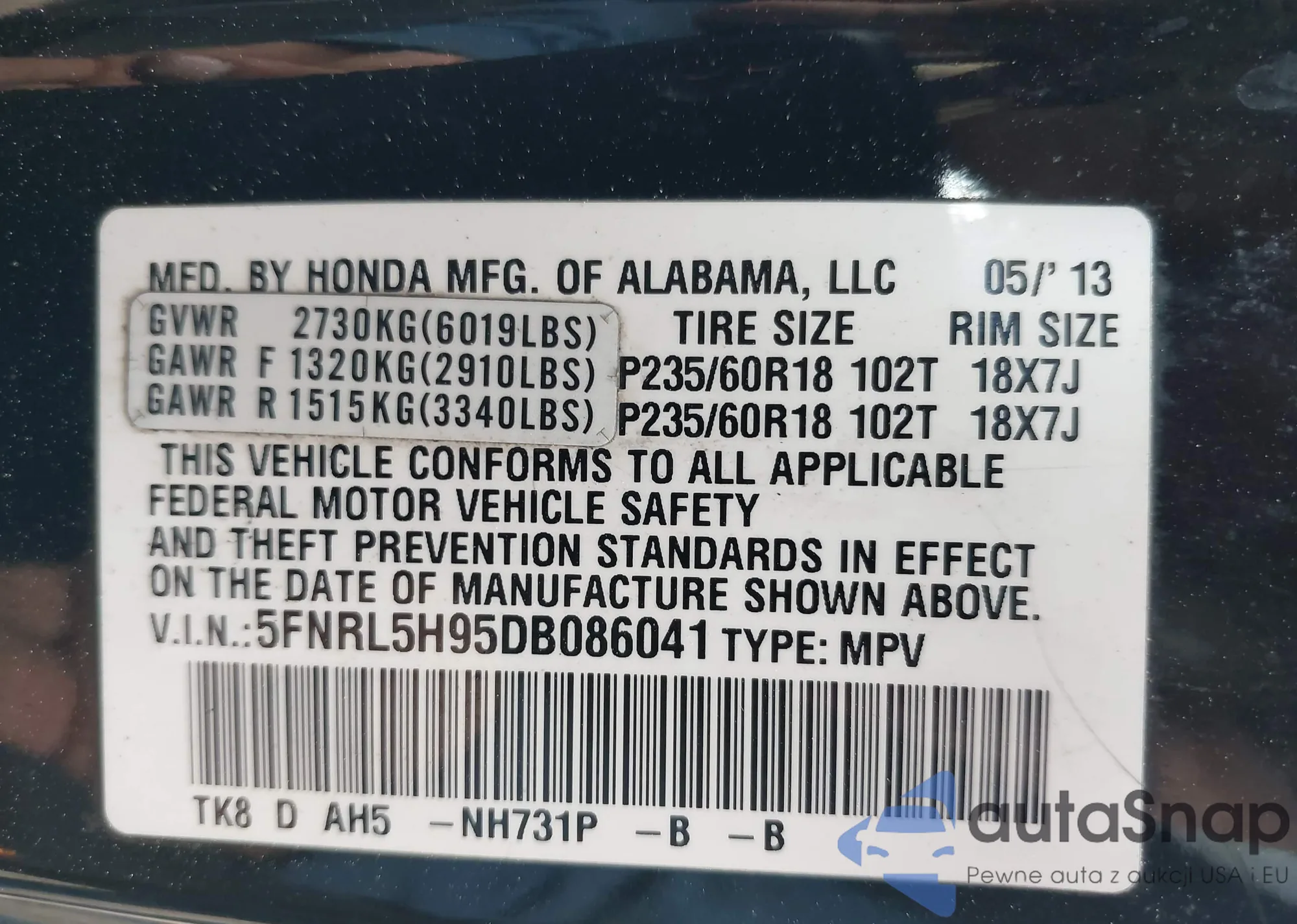 • VIN: 5FNRL5H95DB086041