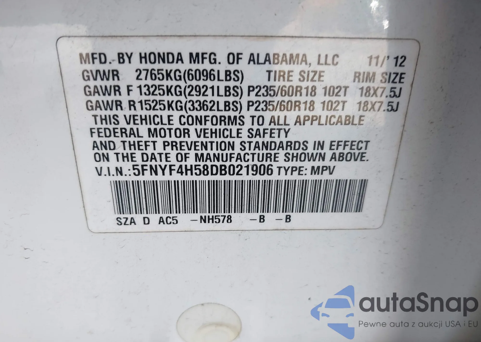 VIN: 5FNYF4H58DB021906