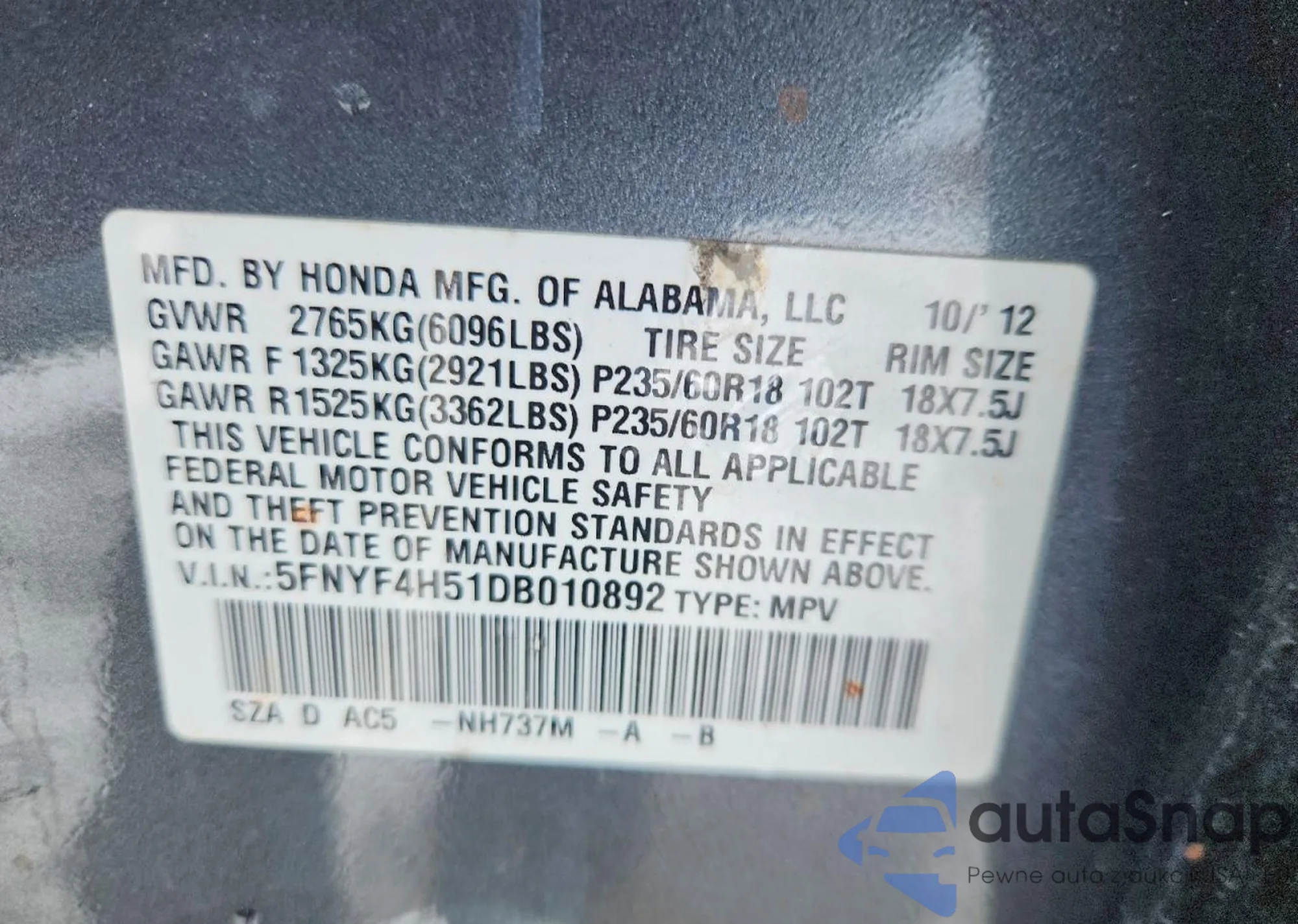 VIN: 5FNYF4H51DB010892