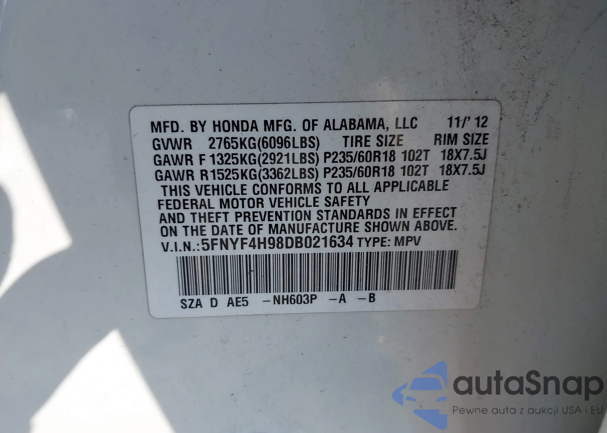 VIN: 5FNYF4H98DB021634