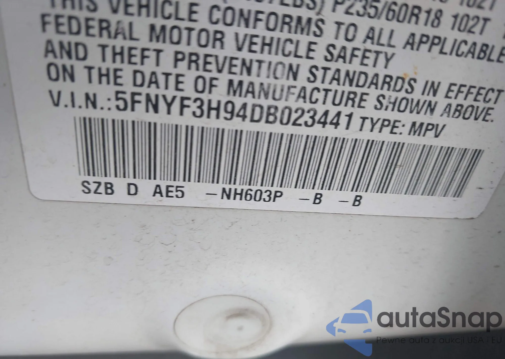 VIN: 5FNYF3H94DB023441