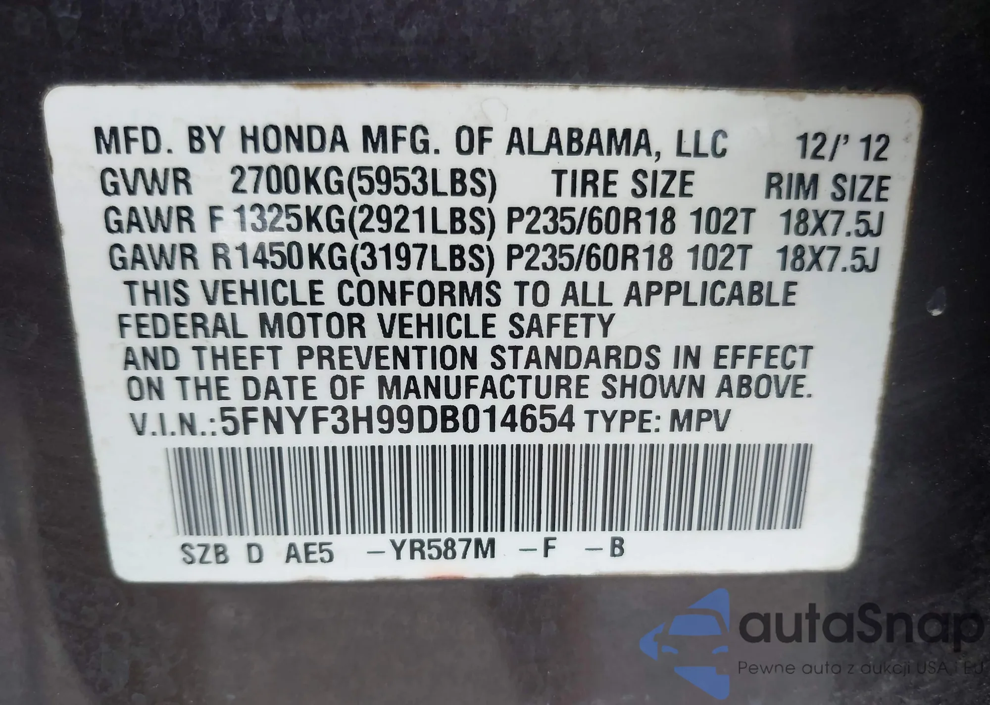 VIN: 5FNYF3H99DB014654