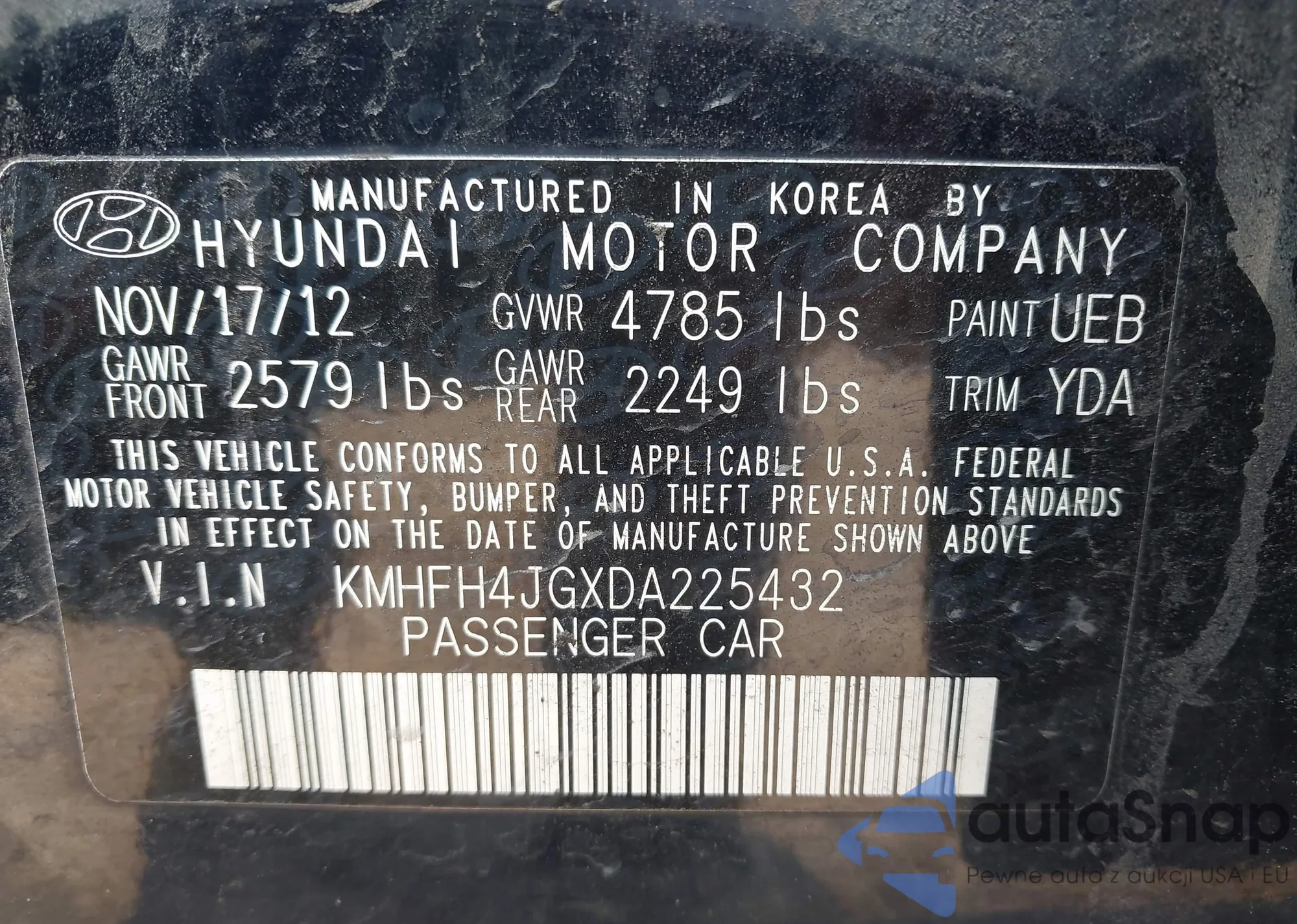 The car Hyundai Azera 2013 (VIN KMHFH4JGXDA225432) has not been auctioned before. The documents are clean, and the mileage matches or is below the market average. Sold by an insurance company – we recommend purchase. Delivery to the port will take approx. 6–8 weeks.