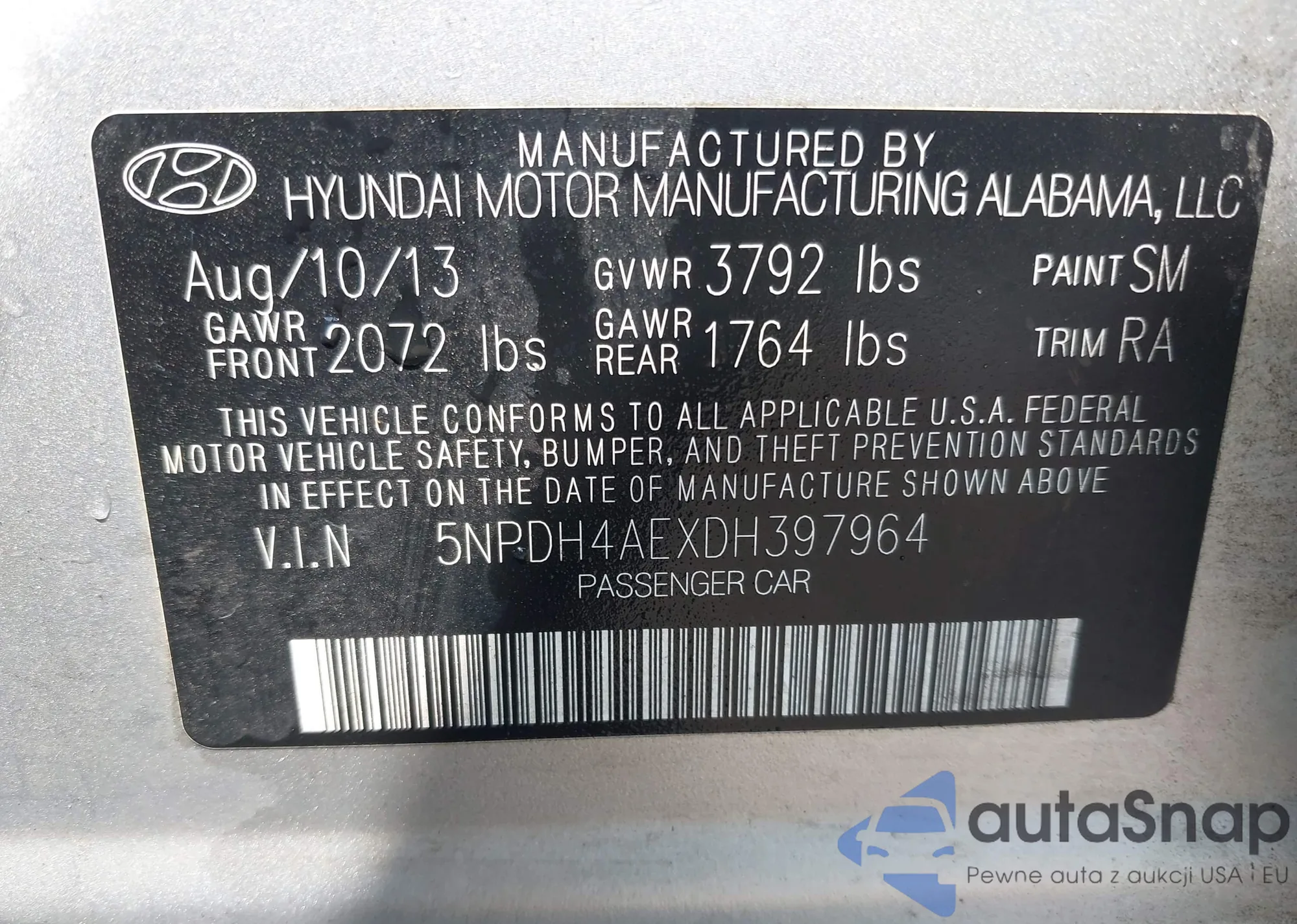 The car Hyundai Elantra 2013 (VIN 5NPDH4AEXDH397964) has not been auctioned before. The documents are clean, and the mileage matches or is below the market average. Sold by an insurance company – we recommend purchase. Delivery to the port will take approx. 6–8 weeks.