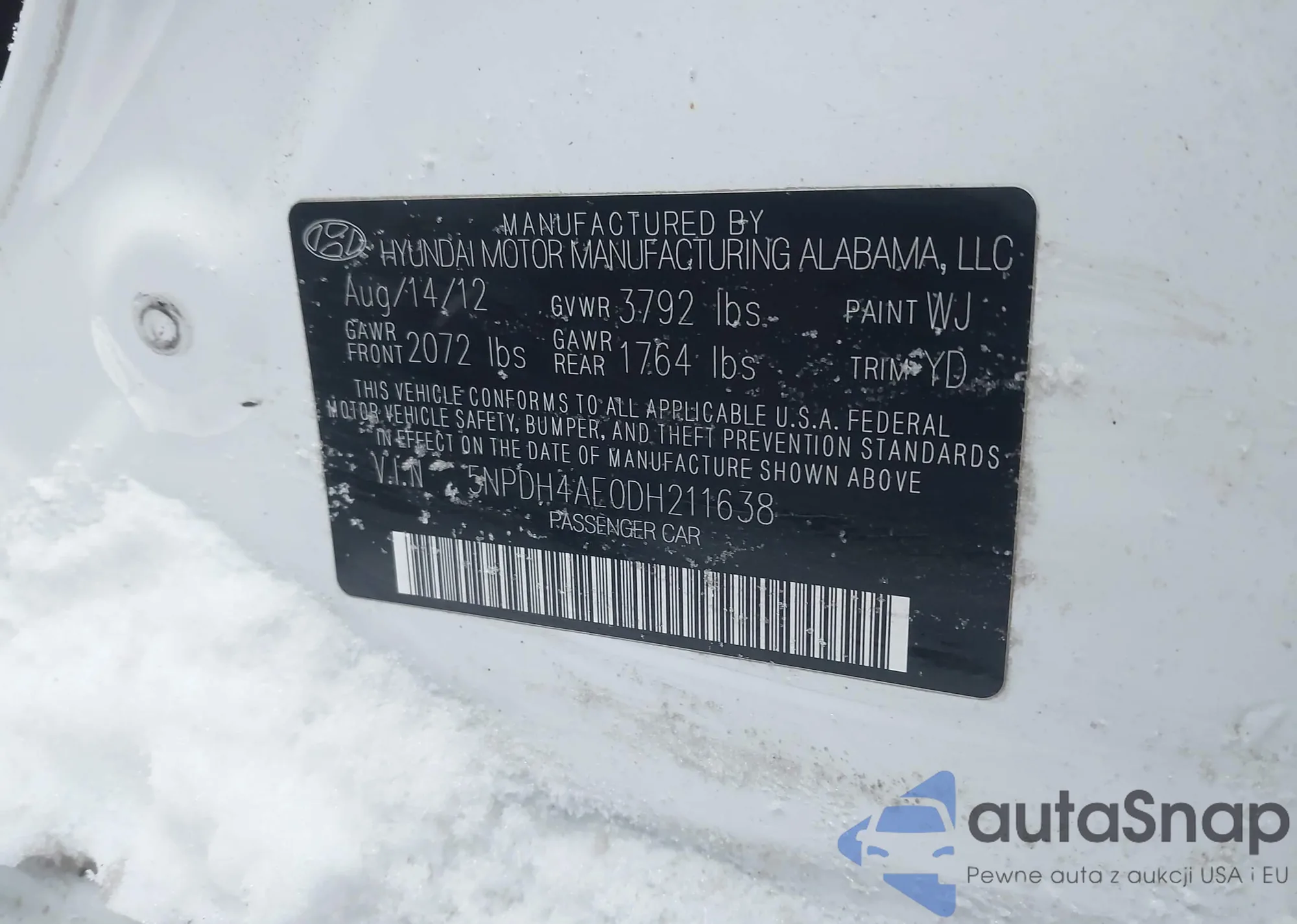 The car Hyundai Elantra 2013 (VIN 5NPDH4AE0DH211638) has not been auctioned before. The documents are clean, and the mileage matches or is below the market average. Sold by an insurance company – we recommend purchase. Delivery to the port will take approx. 6–8 weeks.