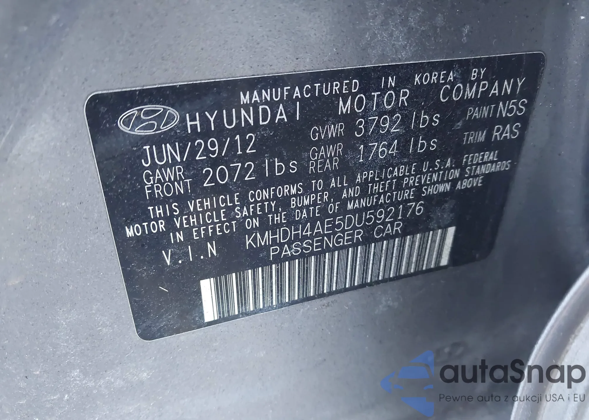 The car Hyundai Elantra 2013 (VIN KMHDH4AE5DU592176) is sold by an unverified seller. We recommend checking the Carfax report and confirming registration possibilities before purchase.