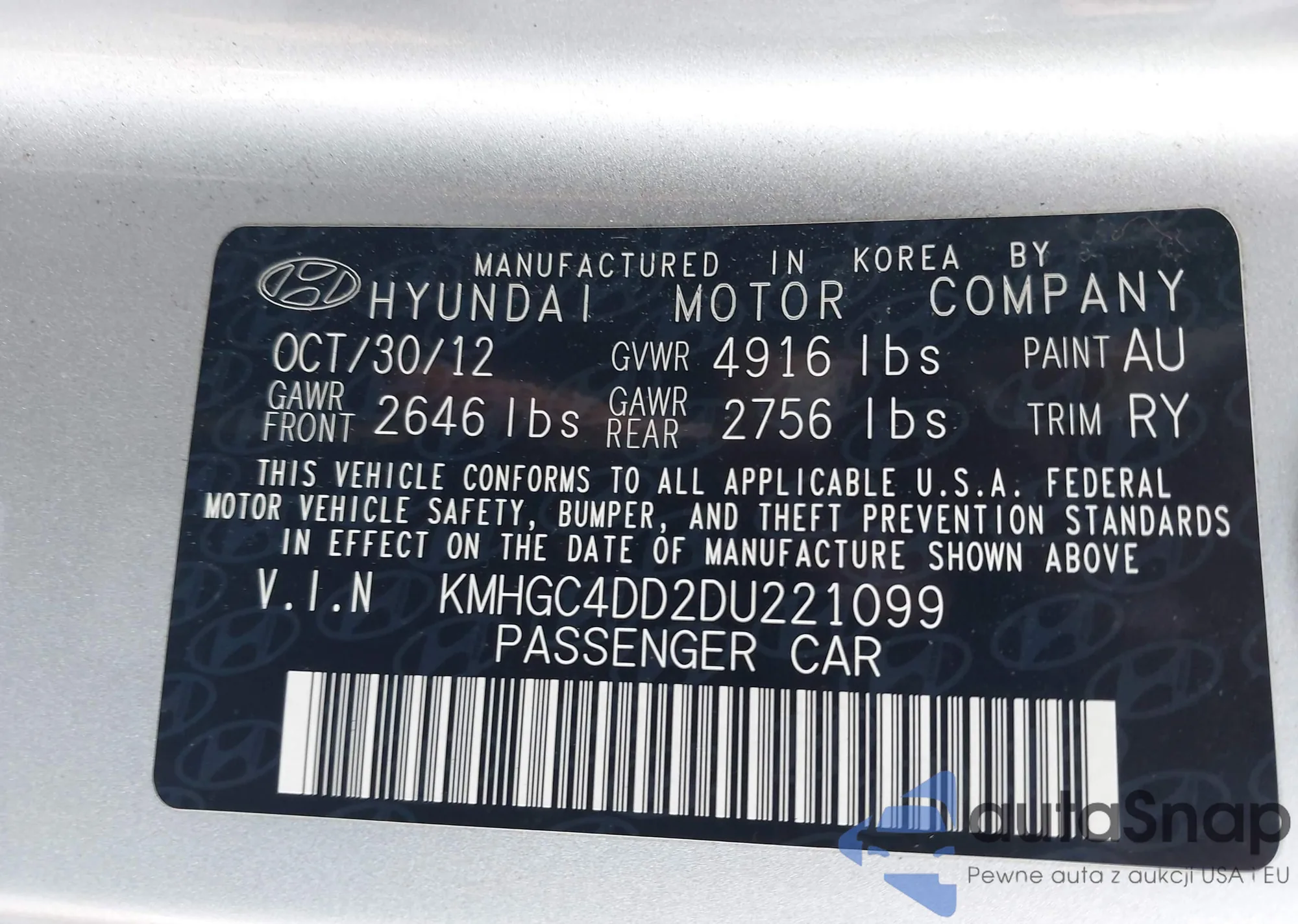 VIN: KMHGC4DD2DU221099