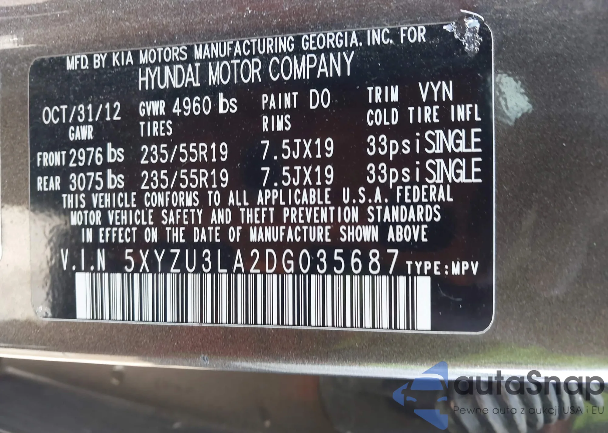The car Hyundai Santa Fe 2013 (VIN 5XYZU3LA2DG035687) has not been auctioned before. The documents are clean, and the mileage matches or is below the market average. Sold by an insurance company – we recommend purchase. Delivery to the port will take approx. 6–8 weeks.