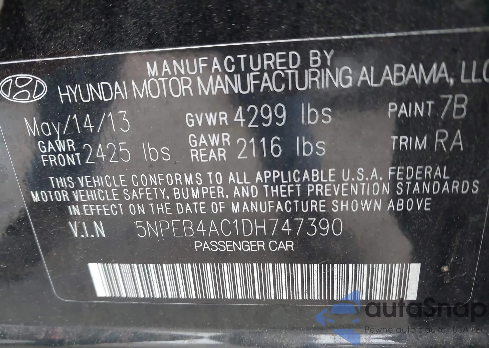 The car Hyundai Sonata 2013 (VIN 5NPEB4AC1DH747390) is sold by an unverified seller. We recommend checking the Carfax report and confirming registration possibilities before purchase.