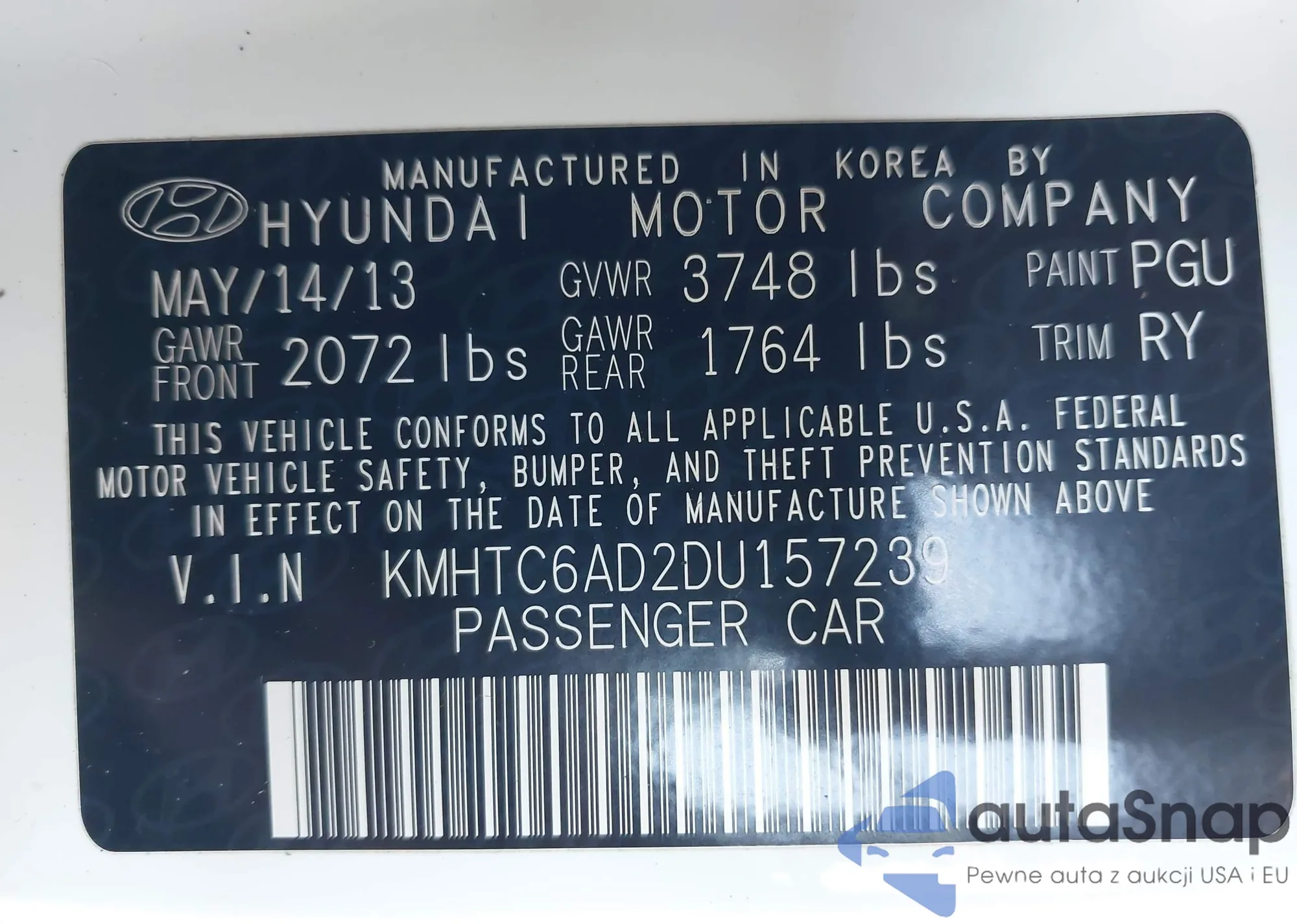 • VIN: KMHTC6AD2DU157239