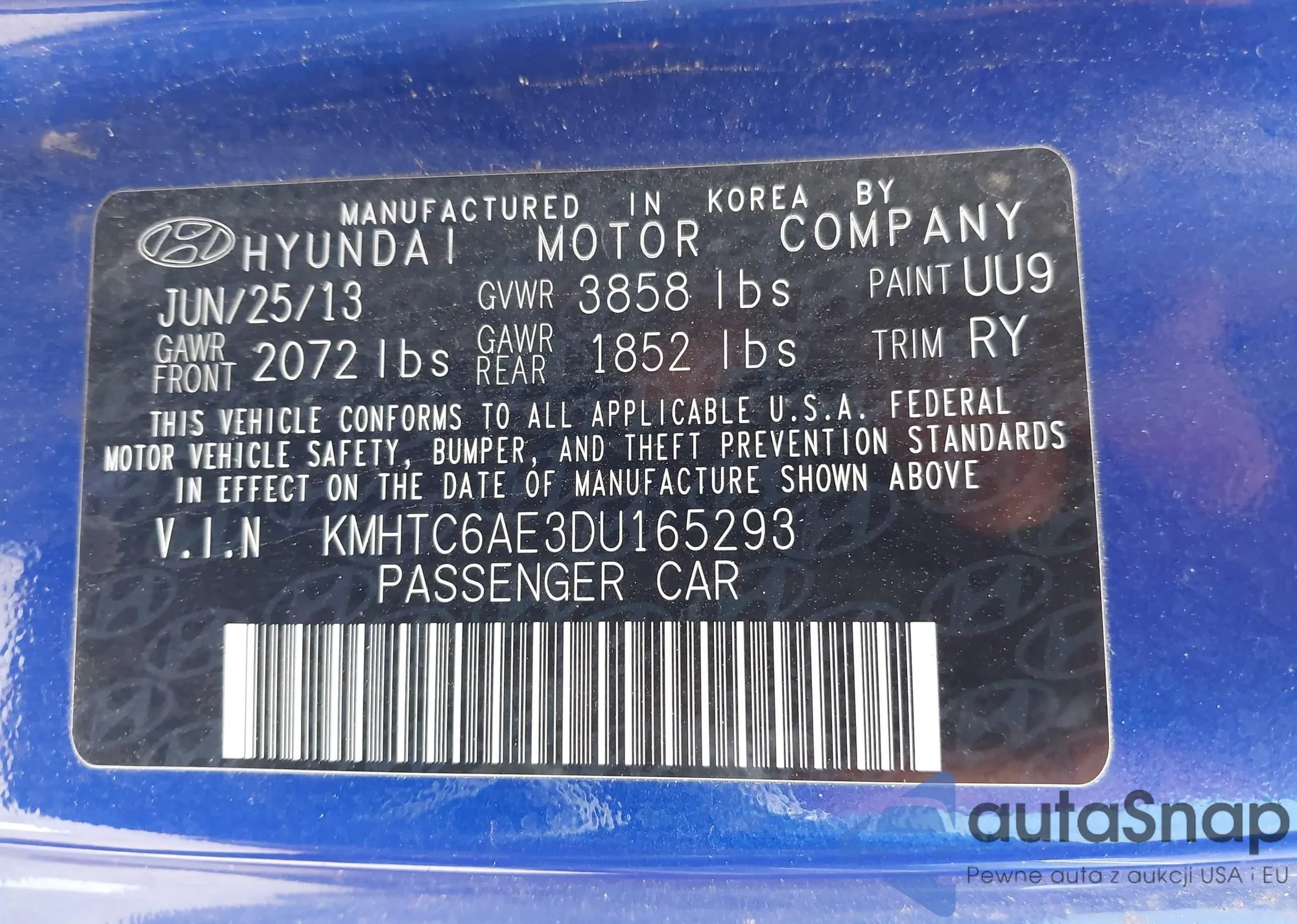 The car Hyundai Veloster 2013 (VIN KMHTC6AE3DU165293) is sold by an unverified seller. We recommend checking the Carfax report and confirming registration possibilities before purchase.
