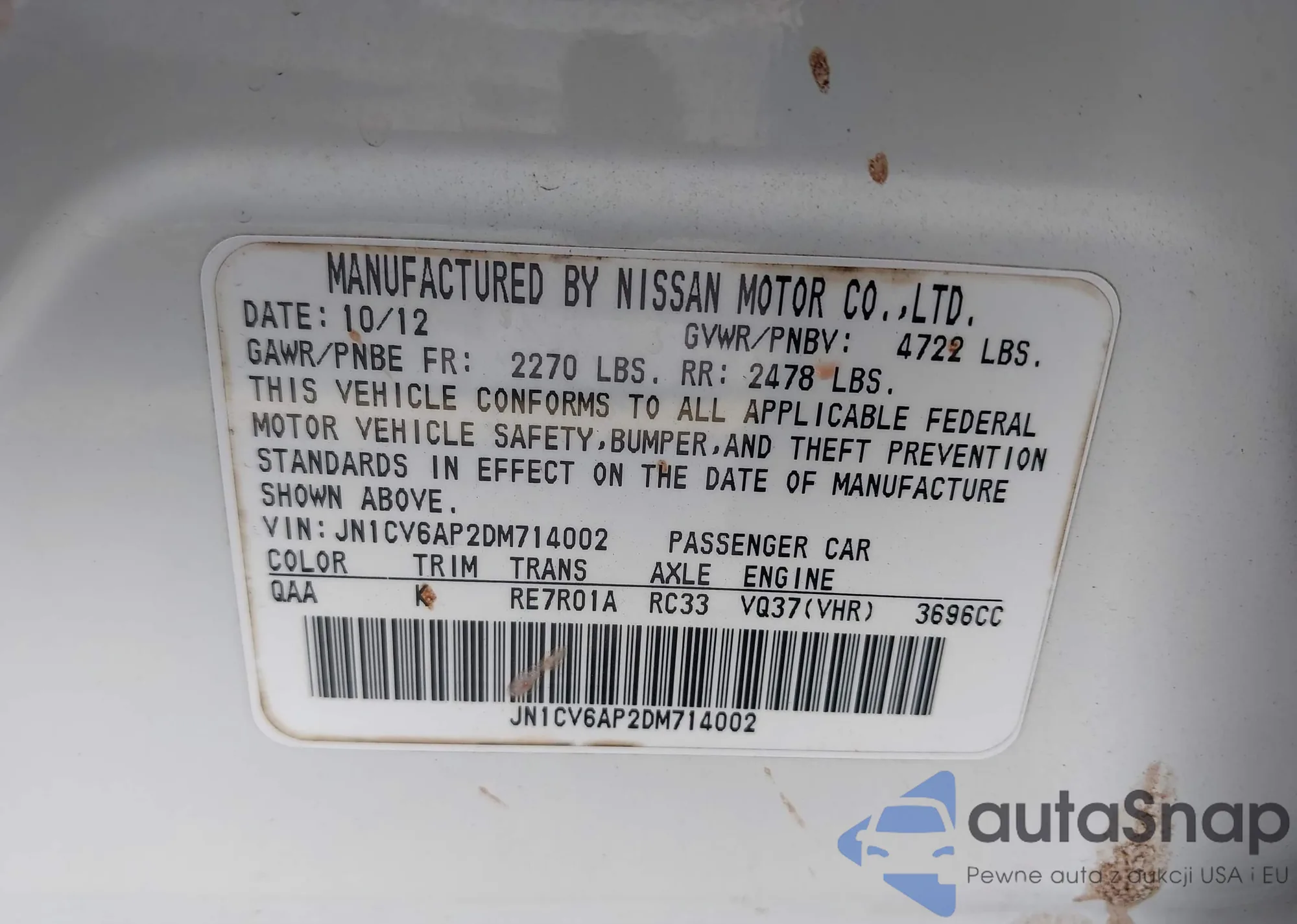 The car Infiniti G 2013 (VIN JN1CV6AP2DM714002) has not been auctioned before. The documents are clean, and the mileage matches or is below the market average. Sold by an insurance company – we recommend purchase. Delivery to the port will take approx. 6–8 weeks.