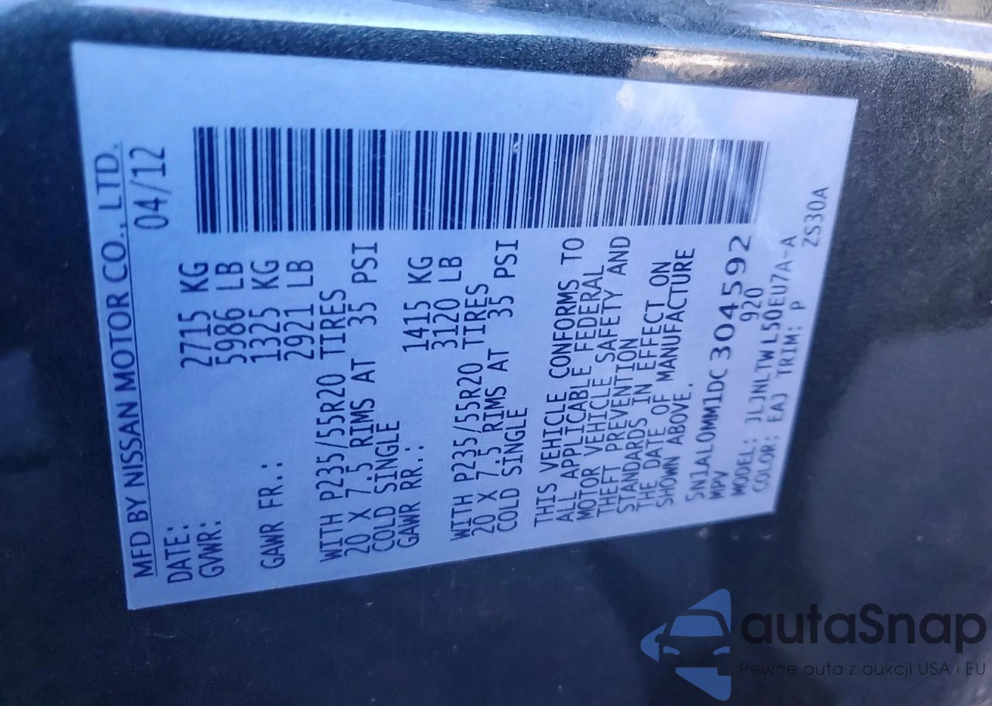The car Infiniti JX 2013 (VIN 5N1AL0MM1DC304592) has documents that prevent registration. Export and registration may be difficult. Contact AutaSnap experts to find alternatives.