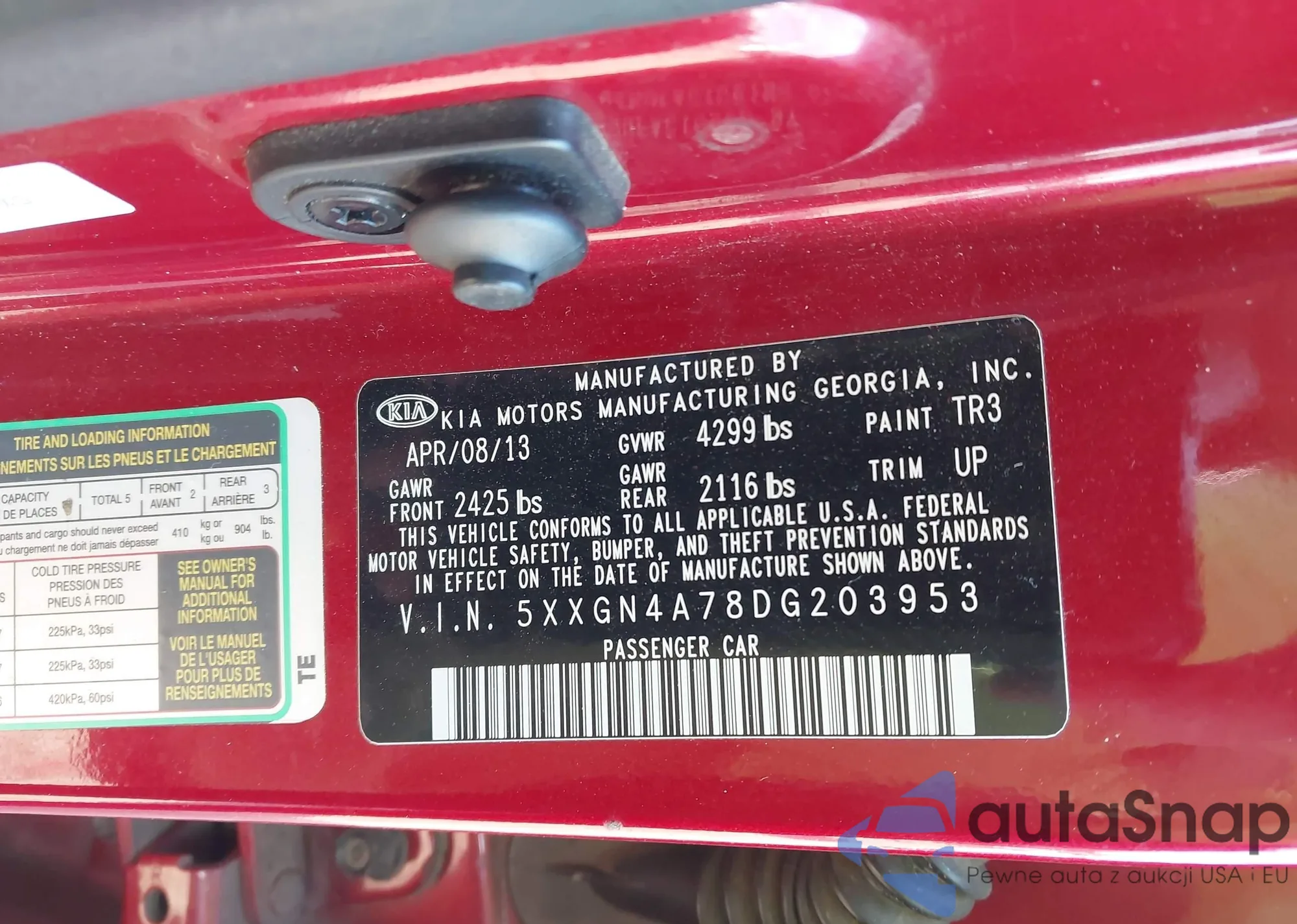 The car Kia Optima 2013 (VIN 5XXGN4A78DG203953) has documents that prevent registration. Export and registration may be difficult. Contact AutaSnap experts to find alternatives.