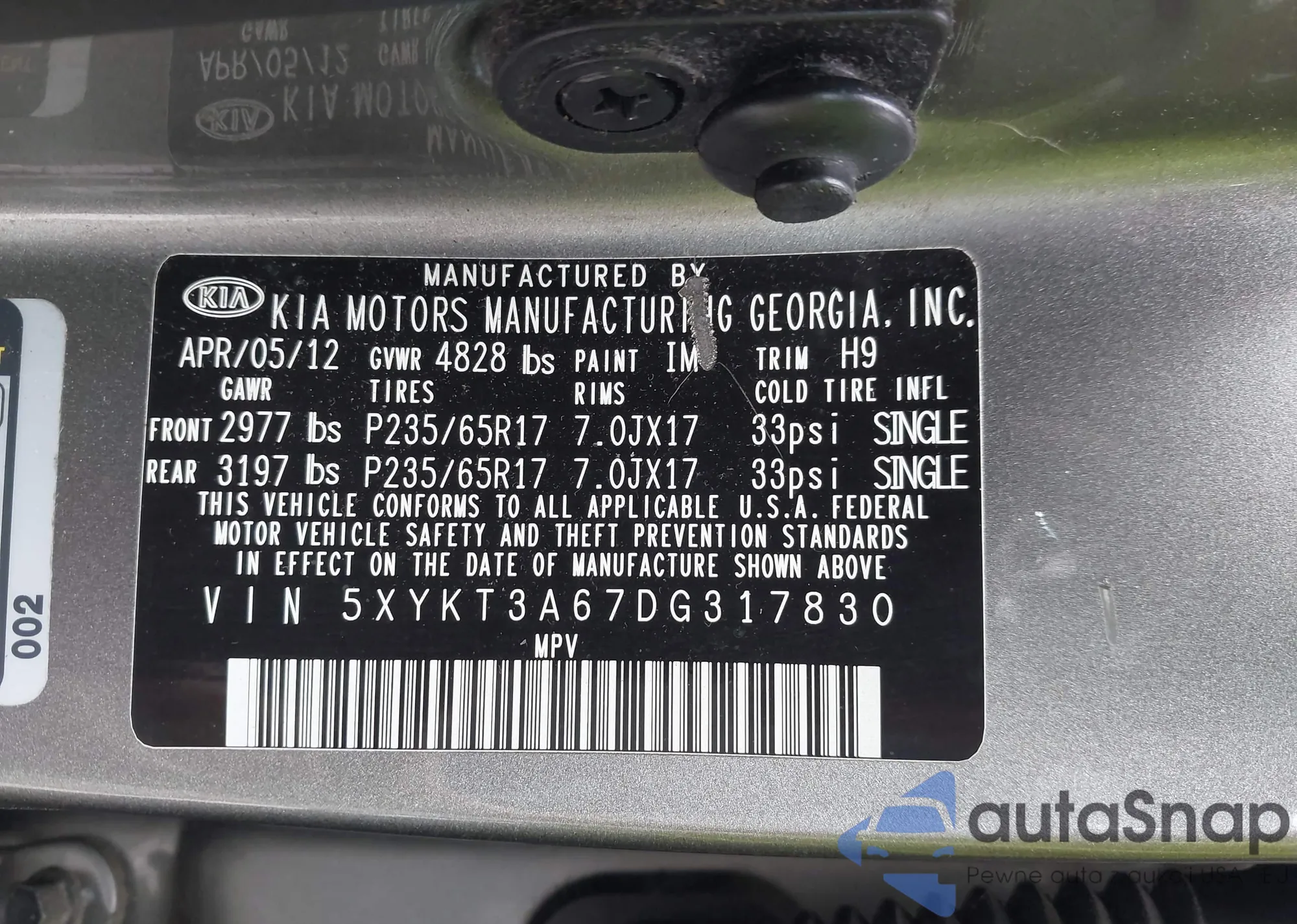 • VIN: 5XYKT3A67DG317830