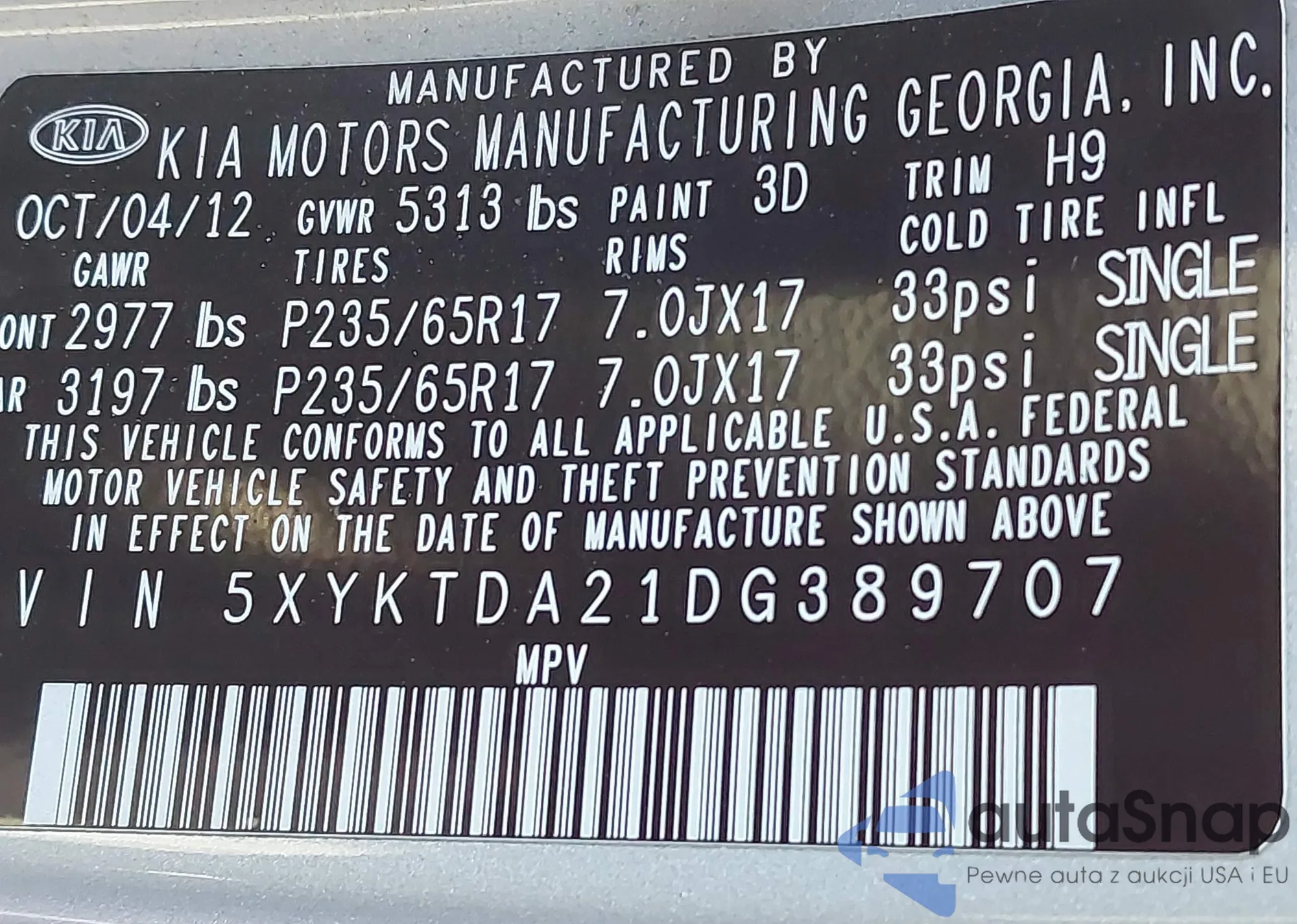 • VIN: 5XYKTDA21DG389707