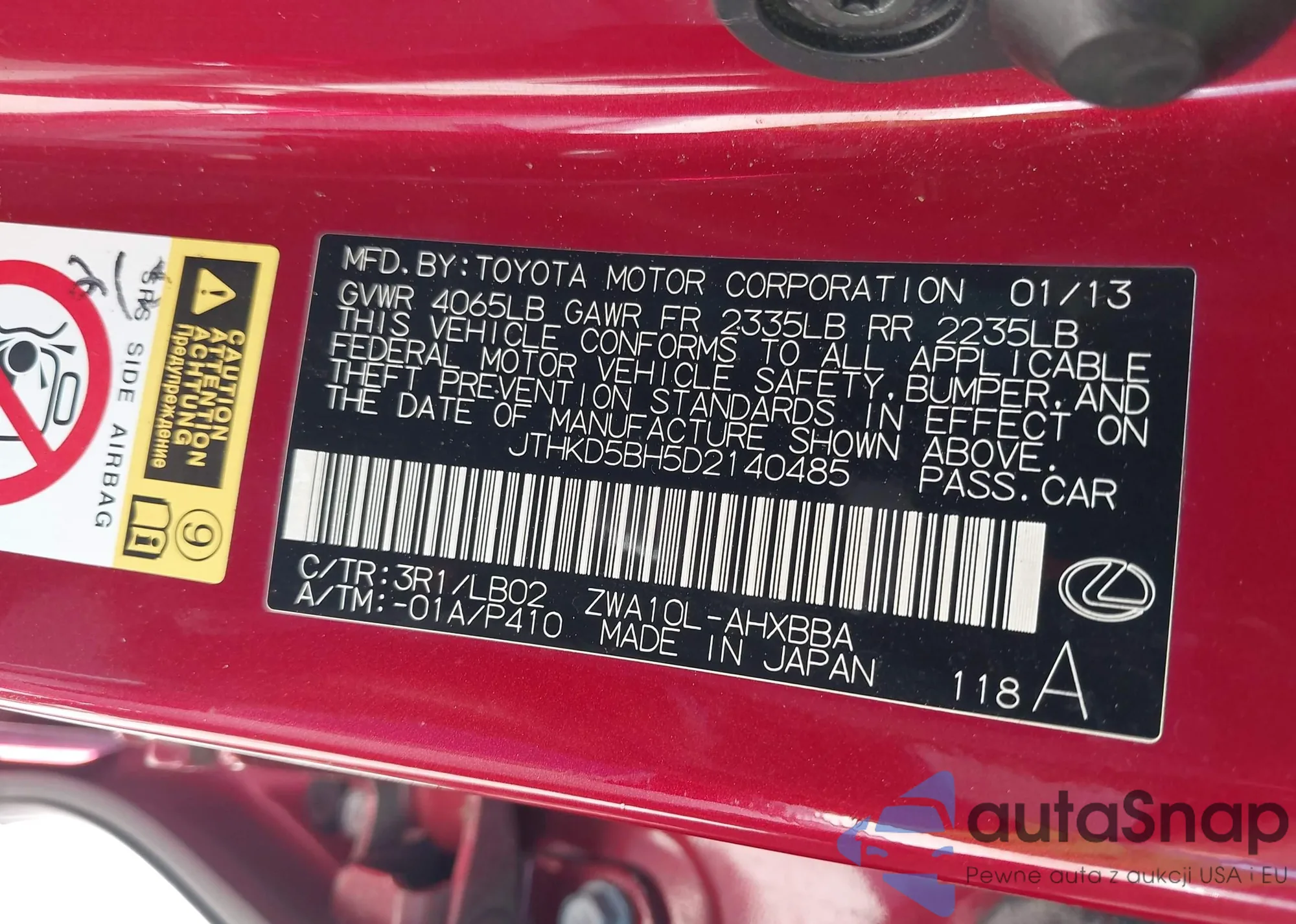 The car Lexus CT 2013 (VIN JTHKD5BH5D2140485) is sold by an unverified seller. We recommend checking the Carfax report and confirming registration possibilities before purchase.