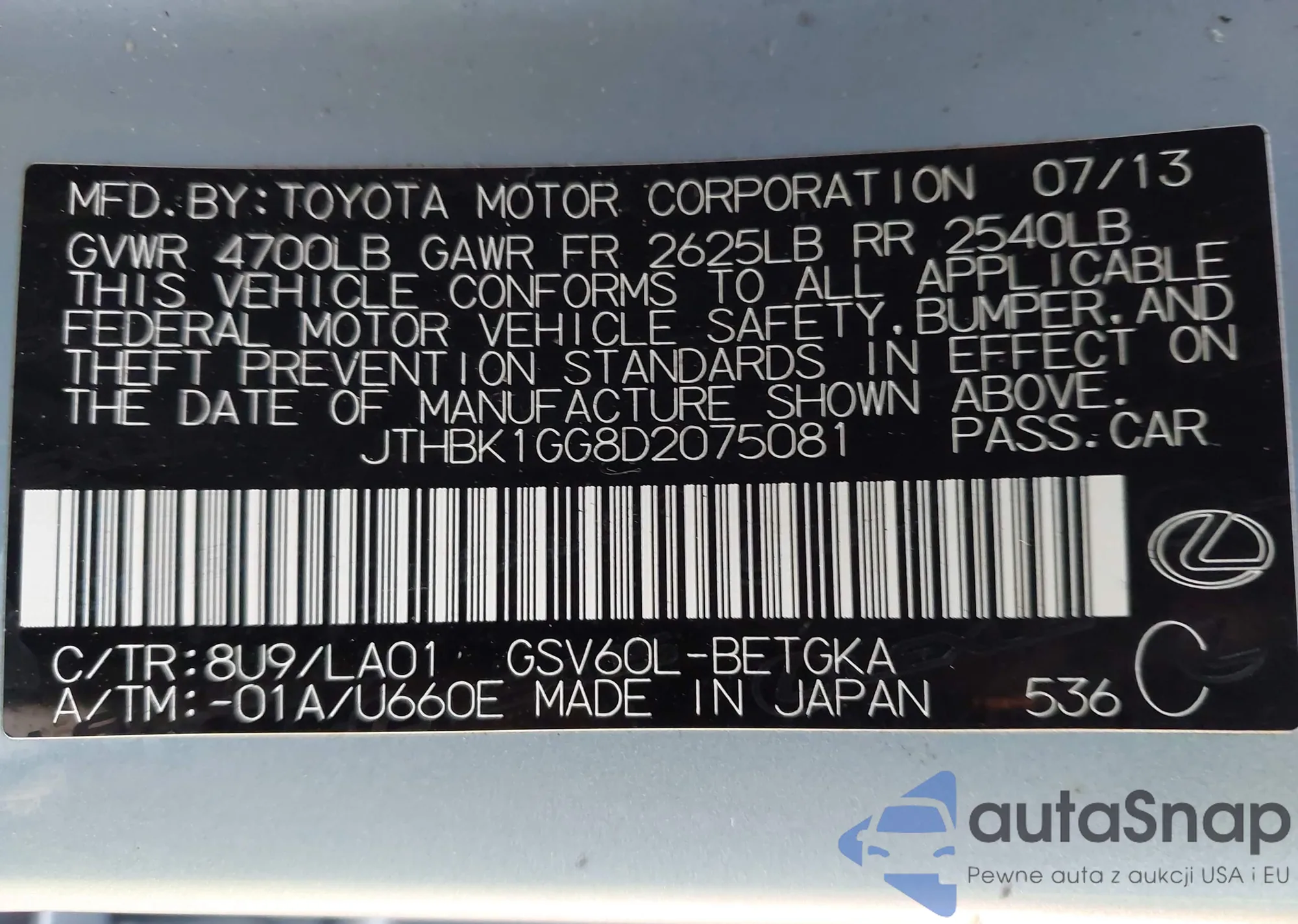 The car Lexus ES 2013 (VIN JTHBK1GG8D2075081) has not been auctioned before. The documents are clean, and the mileage matches or is below the market average. Sold by an insurance company – we recommend purchase. Delivery to the port will take approx. 6–8 weeks.